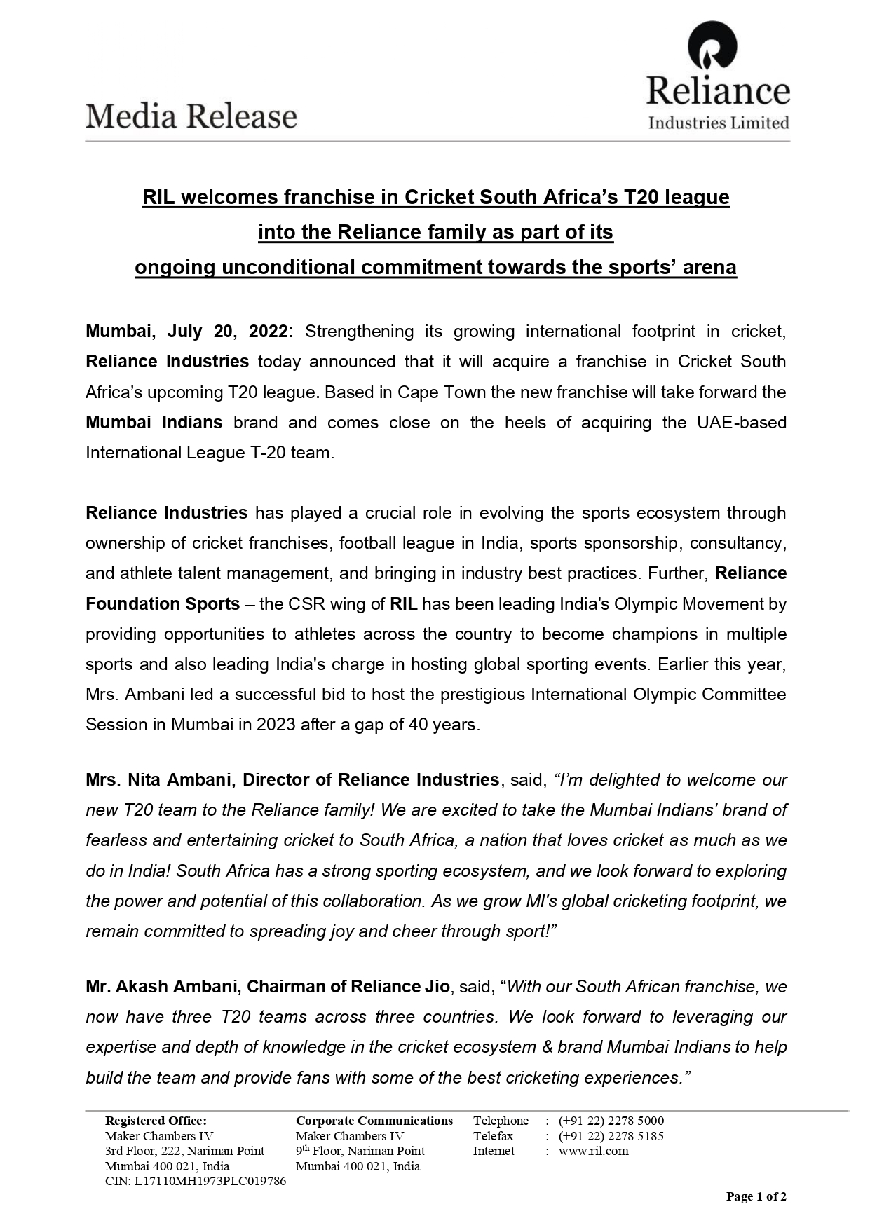 RIL welcomes franchise in Cricket South Africa’s T20 league into the Reliance family as part of its ongoing unconditional commitment towards the sports’ arena. Image Courtesy: Reliance Industries Limited.