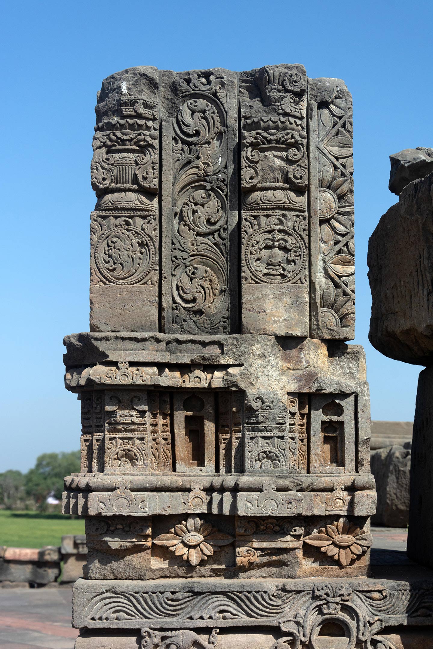 Debris from the original temple was salvaged when the current temple was reconstructed in the 1940s. These have been assembled in parts to form the jagati (raised platform). However, it is not known where they were located in the original temple or if they came from multiple structures. The assembled sections here consist of two blocks stacked on the jagati. The upper block has the kalpavrisksha (tree of life) motif running along a central band. The panels on either side are damaged but visible features include the kalpa lata (creeper) motif (bottom left), the purna ghata (overflowing pot of prosperity) motif (mid-sections), and the kirtimukha motif (bottom right). The block in the middle has the ardha padma (half lotus) motif.