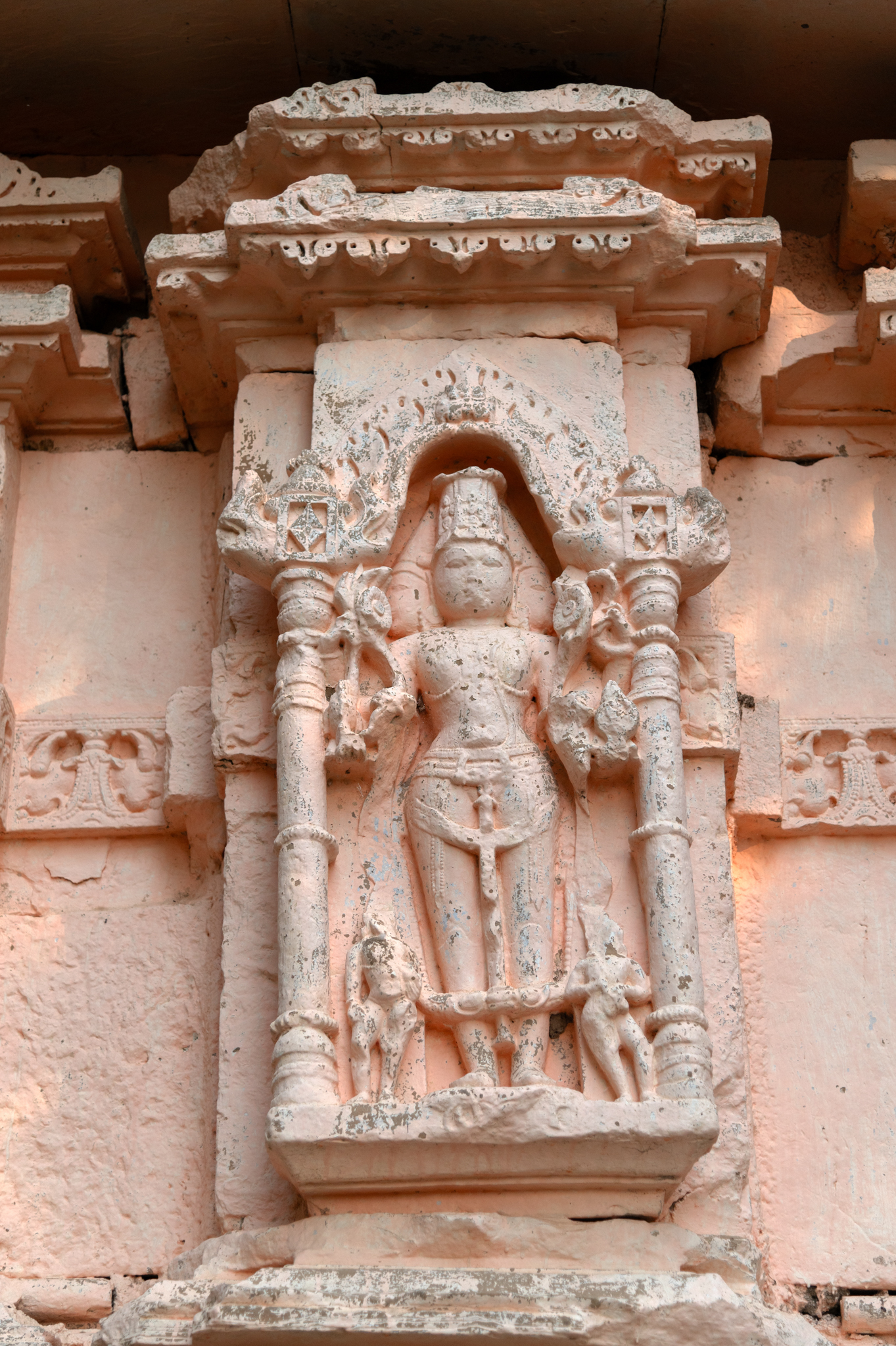 The rear wall of the garbhagriha has a projection depicting a syncretic image. This image depicts Surya, Vishnu and Shiva coming together to form a deity called Hari-Hara Hiranyagarbha. The deity is depicted with three heads and six arms, standing alongside his attendants Dandaka and Pingala. Adorned with a beautiful crown and jewellery, the deity is wearing knee-length boots, which confirms that the frontal face and body represent Surya, who is shown holding flowers in both his hands. While in his upper hands, one can notice sarpa (snakes) which is an attribute of Shiva, and the lower arms grasp a shankha (conch shell) and chakra (discus), symbols associated with Vishnu.