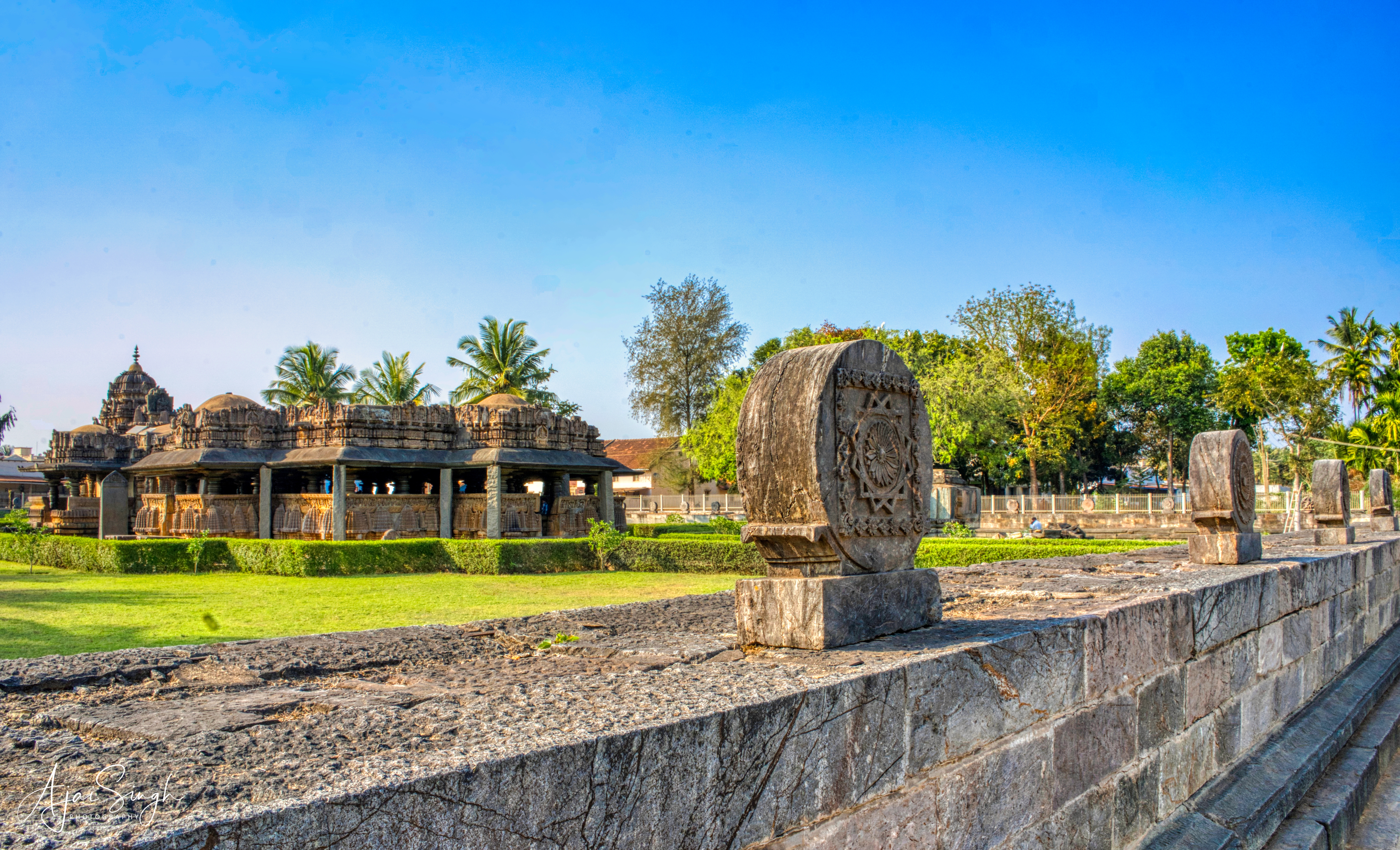 The temple seen from across the original boundary wall, decorated with circular carvings Público Deposited