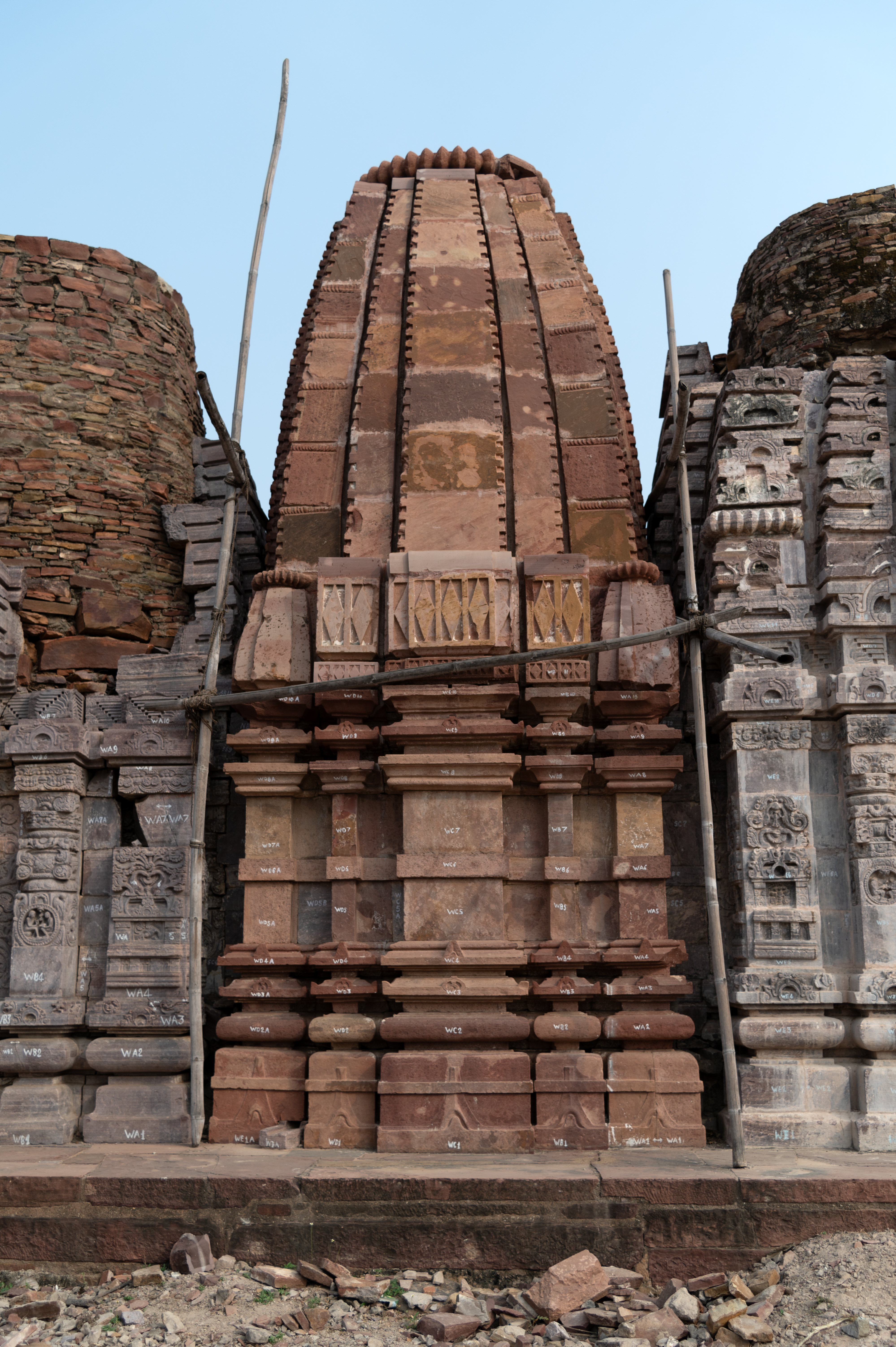 The central shrine of the Triple Shrine Temple is a later addition to the edifice. Built in red sandstone, this single-shrine temple is also adorned with a shikhara (superstructure) of the latina (mono-spire) variety. The base mouldings and the wall of this shrine are built in a pancharatha design, that is, consisting of five divisions to the plan and elevation. The finial of the shikhara has amalaka (ribbed disc). The temple exterior does not have any sculptures or ornamentation. The latina shikhara has small aedicules on the corners and a mulashringa (main spire) consisting of five bands. The corner bands of the shikhara have seven blocks separated by flat ribbed discs.