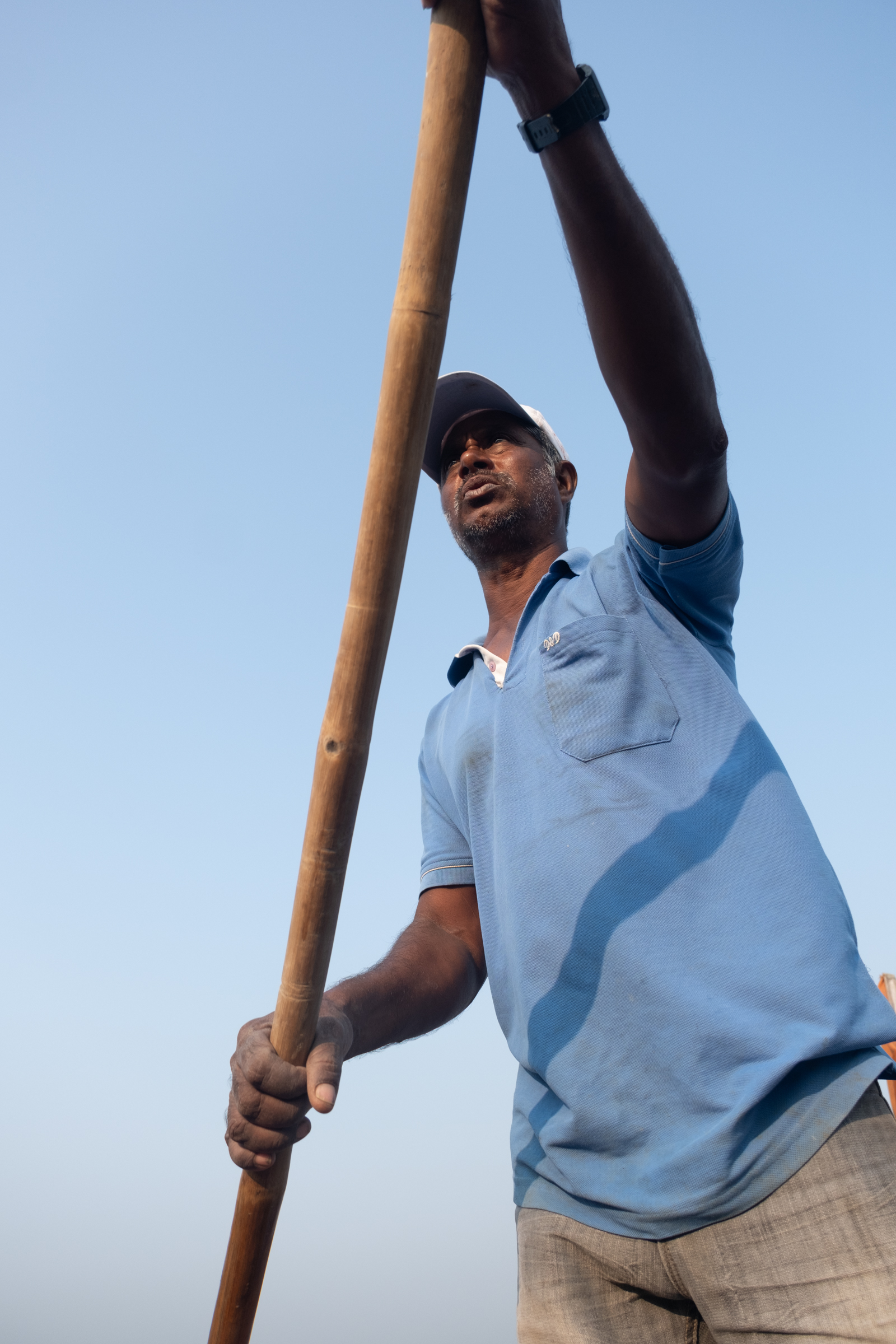 Rakesh Bhalia has been a fisherman for 35 years. Before running a motorboat, he operated paddle boats with wooden oars. He still relies on oars when navigating through mangroves and shallow waters near the shore. Underwater rocky outcrops can easily damage a wooden boat if not navigated carefully.