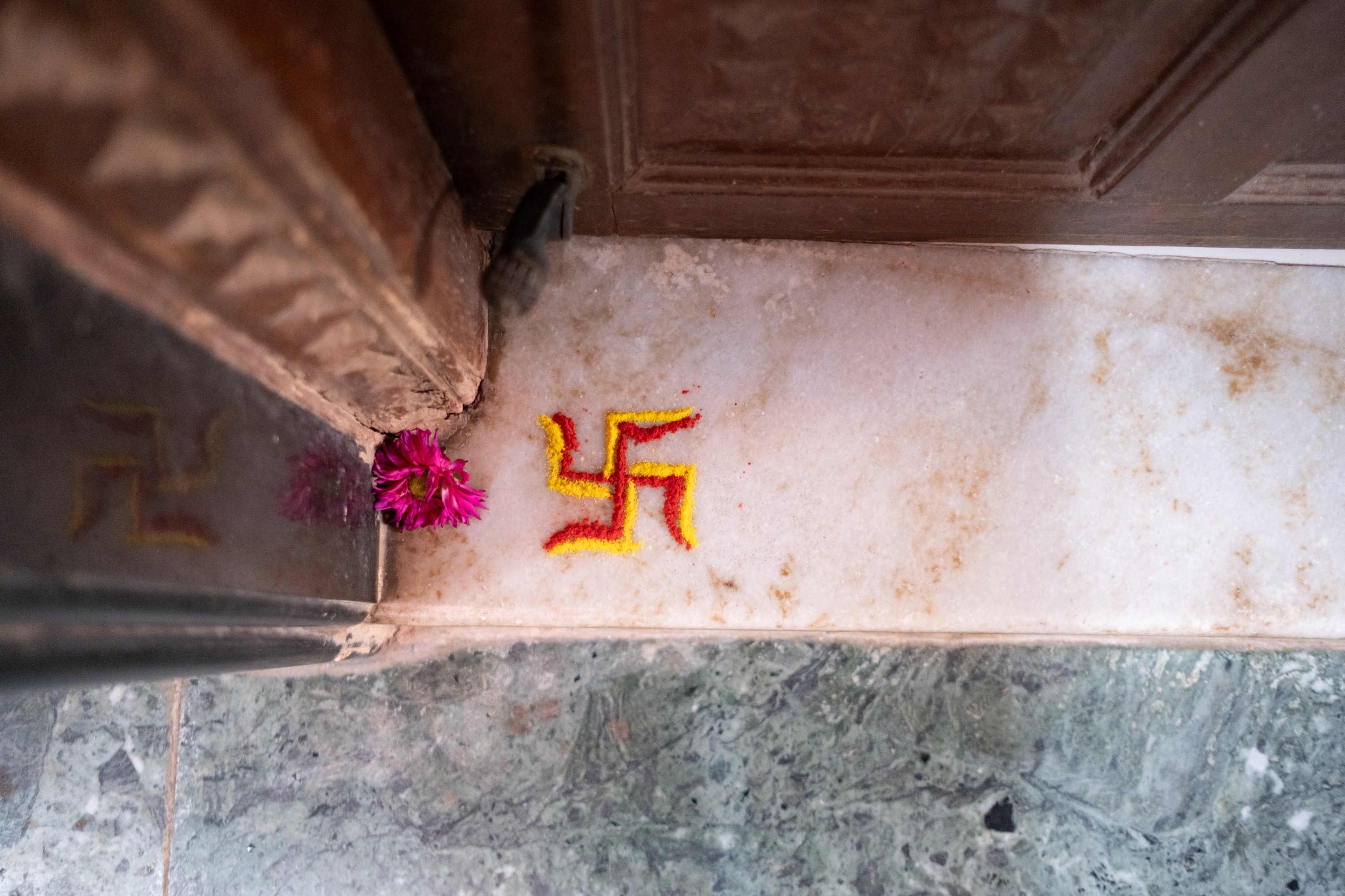 Hindu families draw the swastika, an auspicious symbol, in rangoli (coloured sand) outside their homes on auspicious occasions.