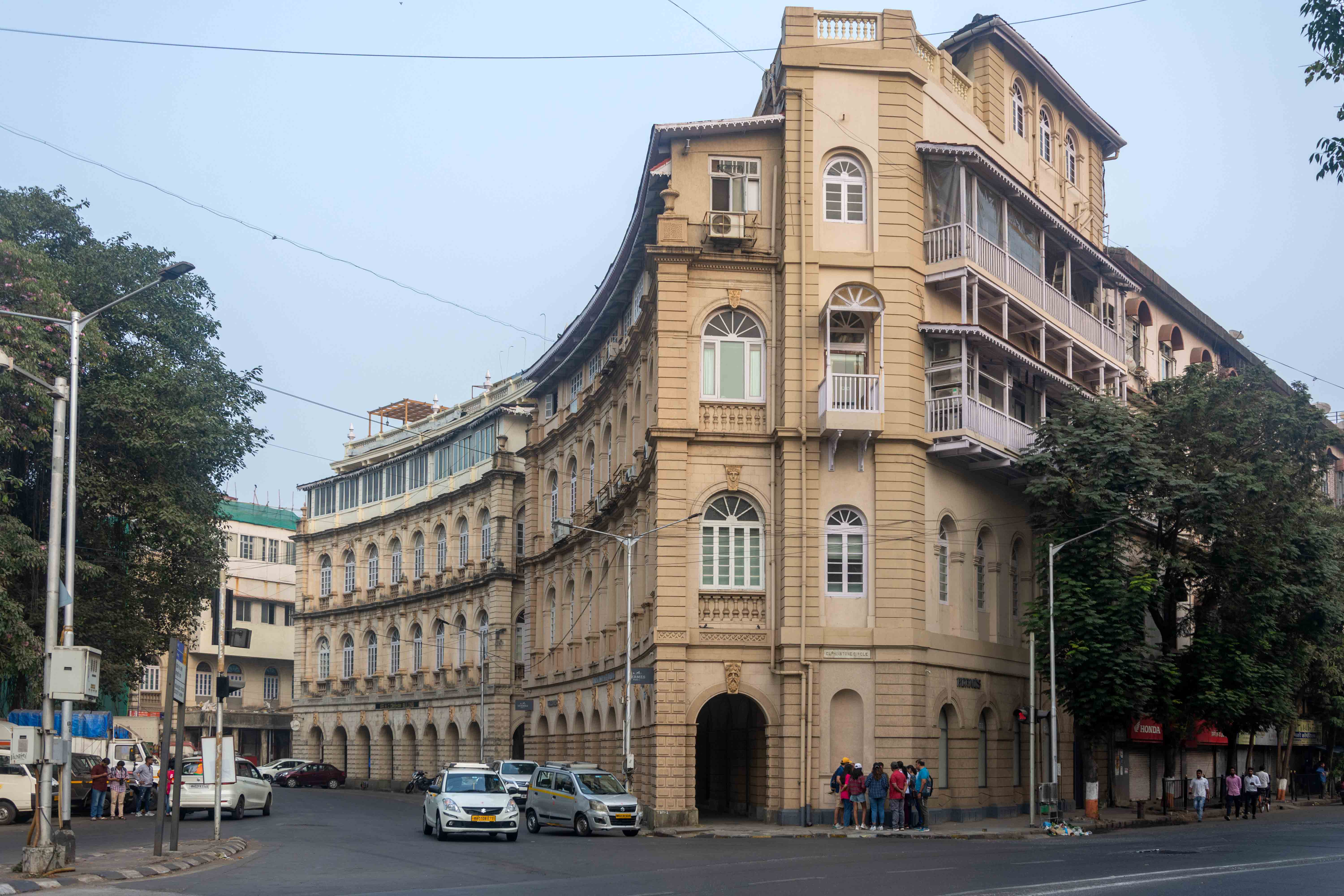 Foundation stone for the buildings around Elphinstone Circle was laid in 1864 by Sir Bartle Frere. The Bombay Gazetteer records, ‘Old Bombay Green was purchased by the Municipality and resold by them at a profit in building lots to English mercantile firms. This gradually transformed the dusty space into an imposing example of street architecture.’