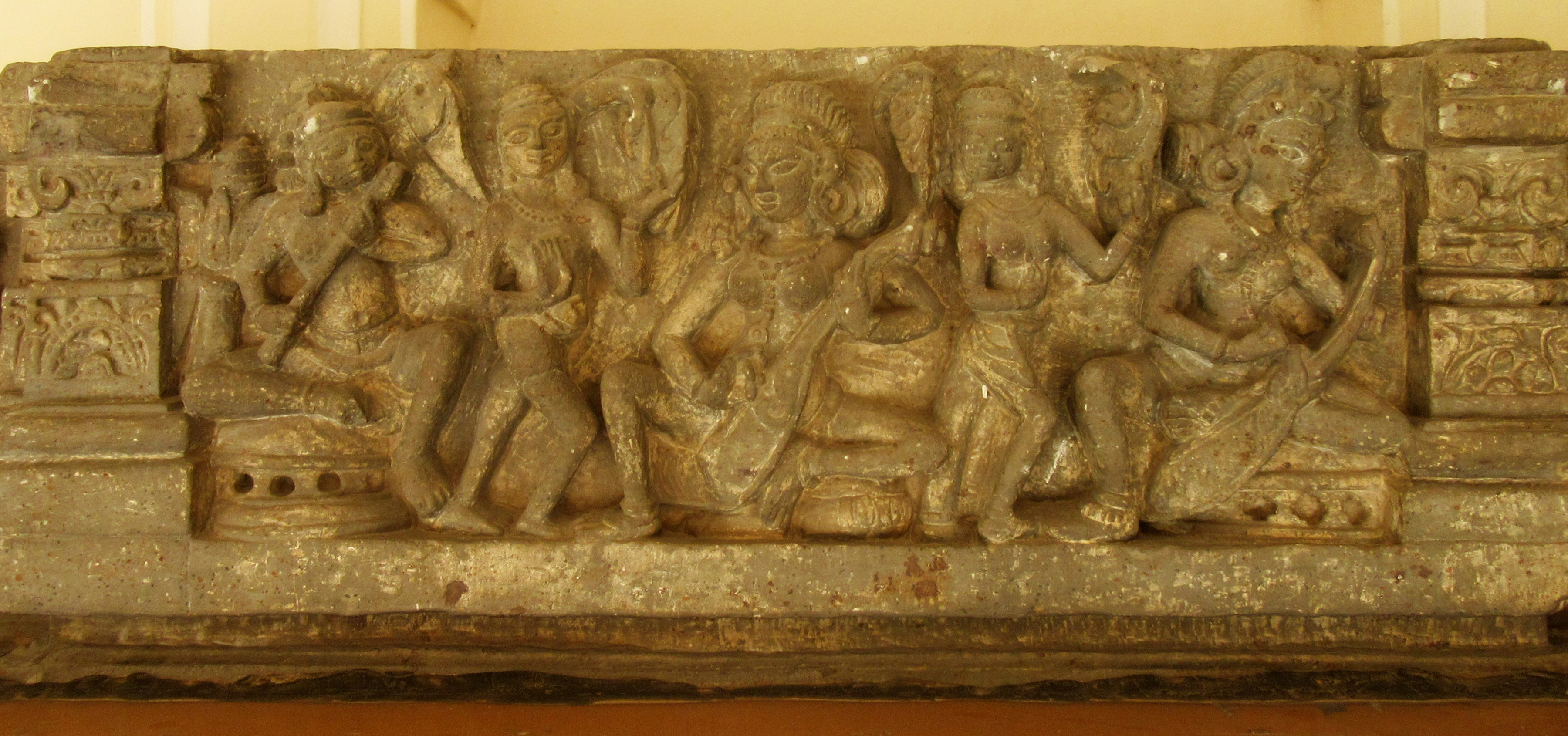 Musicians, dancers, and harp players are present on the central section of the lintel. The right section has a depiction of Kubera with a female attendant serving wine; the left section has a seated Durga in a padmasana position on a lotus with eight hands holding a bow, kamandala (pitcher), sword, shield, and rosary. Other details are unclear. There are two addorsed lions present beneath the lotus. There are also two attendants present. Picture Courtesy: Hawa Mahal Museum