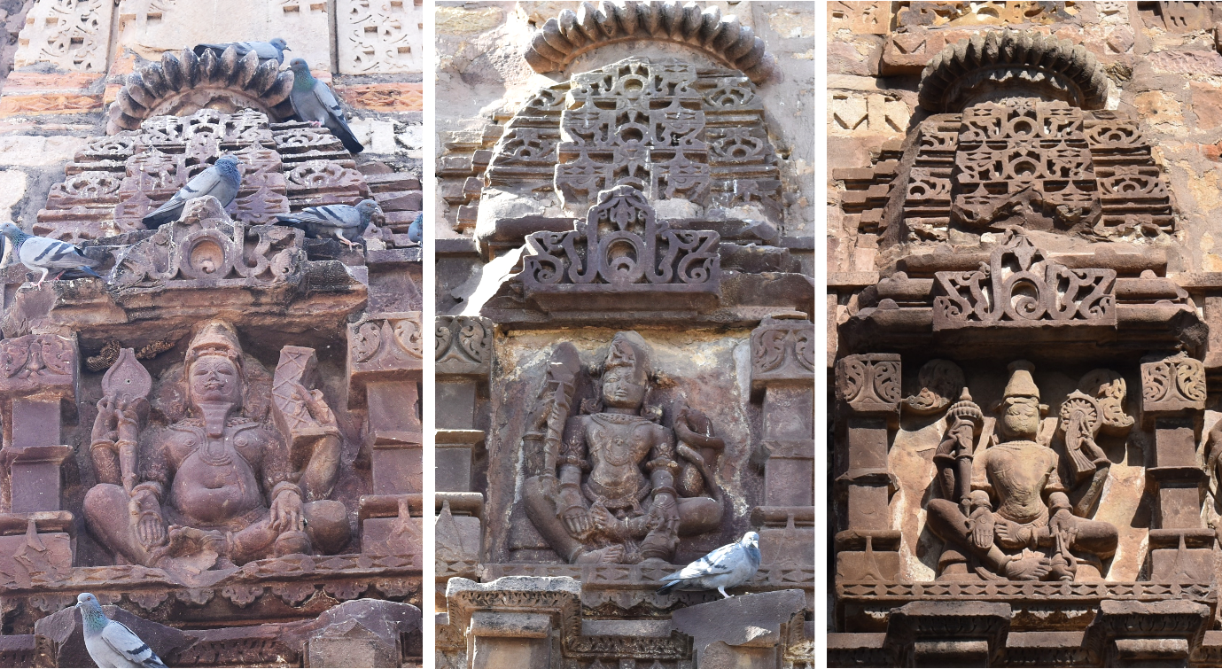 Brahma (right), Shiva (center), Vishnu (left), shikhara, garbhagriha, Mahakal Temple, Bijolia, Bhilwara, Rajasthan, 11th-13th century CE.
