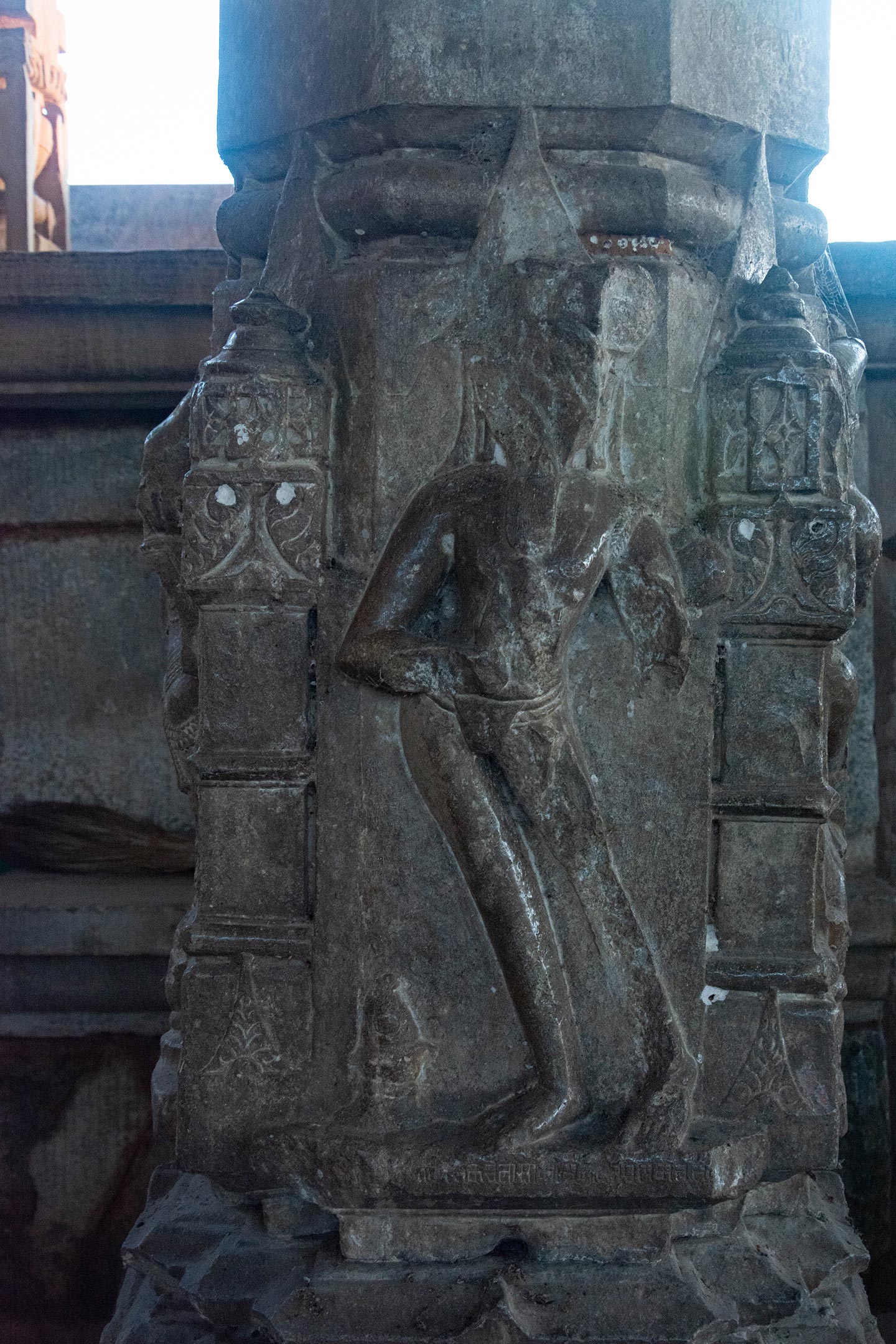 The ascetic is shown on one of the pillars with a long beard and what seems like a jata. A kamandala is tied to one of his shoulders through a rope. He wears nothing but a kopina/loin cloth and the sacred thread janeyu, shown quite prominently. Janeyu reminds us that the lineage of ascetics in the Pashupata sect has been predominantly Brahmins, right from the time of Lakulisha and his four disciples and even Lakulisha has been elsewhere depicted in this temple with a prominent janeyu. The bare minimum clothing and kamandalu are signifiers of his asceticism.