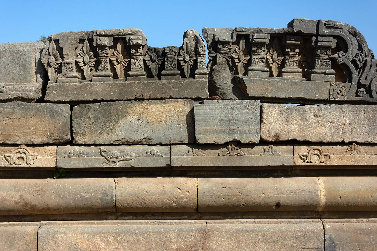 Broken fragments and debris from the original temple assembled on the adhisthana on the southeast side. Relief carvings of geometric, flora and fauna motifs feature all around the adhisthana. Seen here is a carving of a peacock.