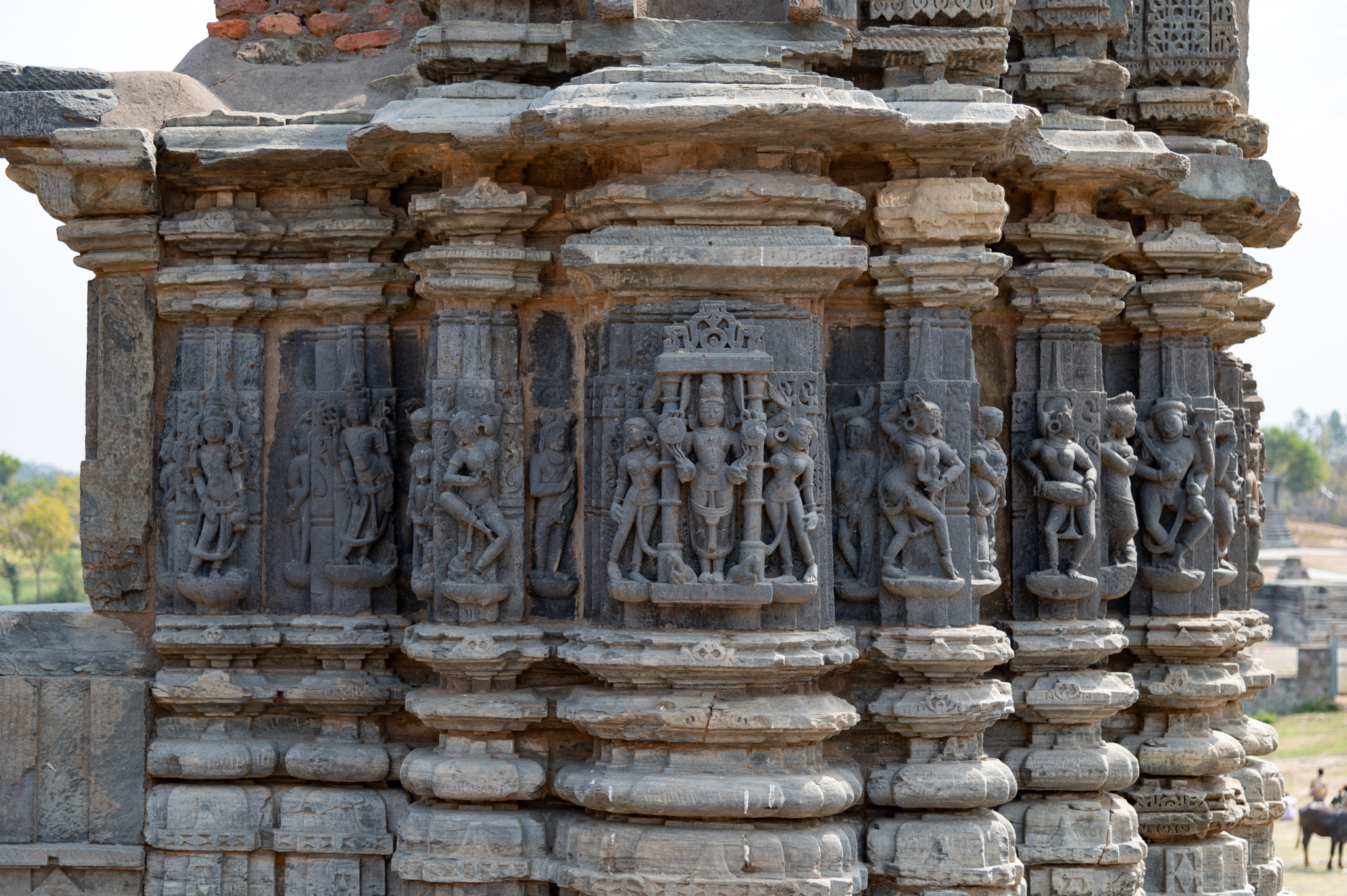 This is a closer view of the north-facing jangha (wall) of the subsidiary shrine in the southeastern corner of the Someshwar Mahadev temple complex. The wall of the pancharatha (five vertical projections on each side) shrine is very ornate. The bhadra (central projection) that faces west has the depiction of Surya. The other projections have depictions of dancers, apsaras (celestial damsels), and dikpalas (deities for cardinal directions). The presence of an image of Surya holding lotuses in the upper hands, on the exterior wall indicates that the shrine must have been dedicated to Surya.