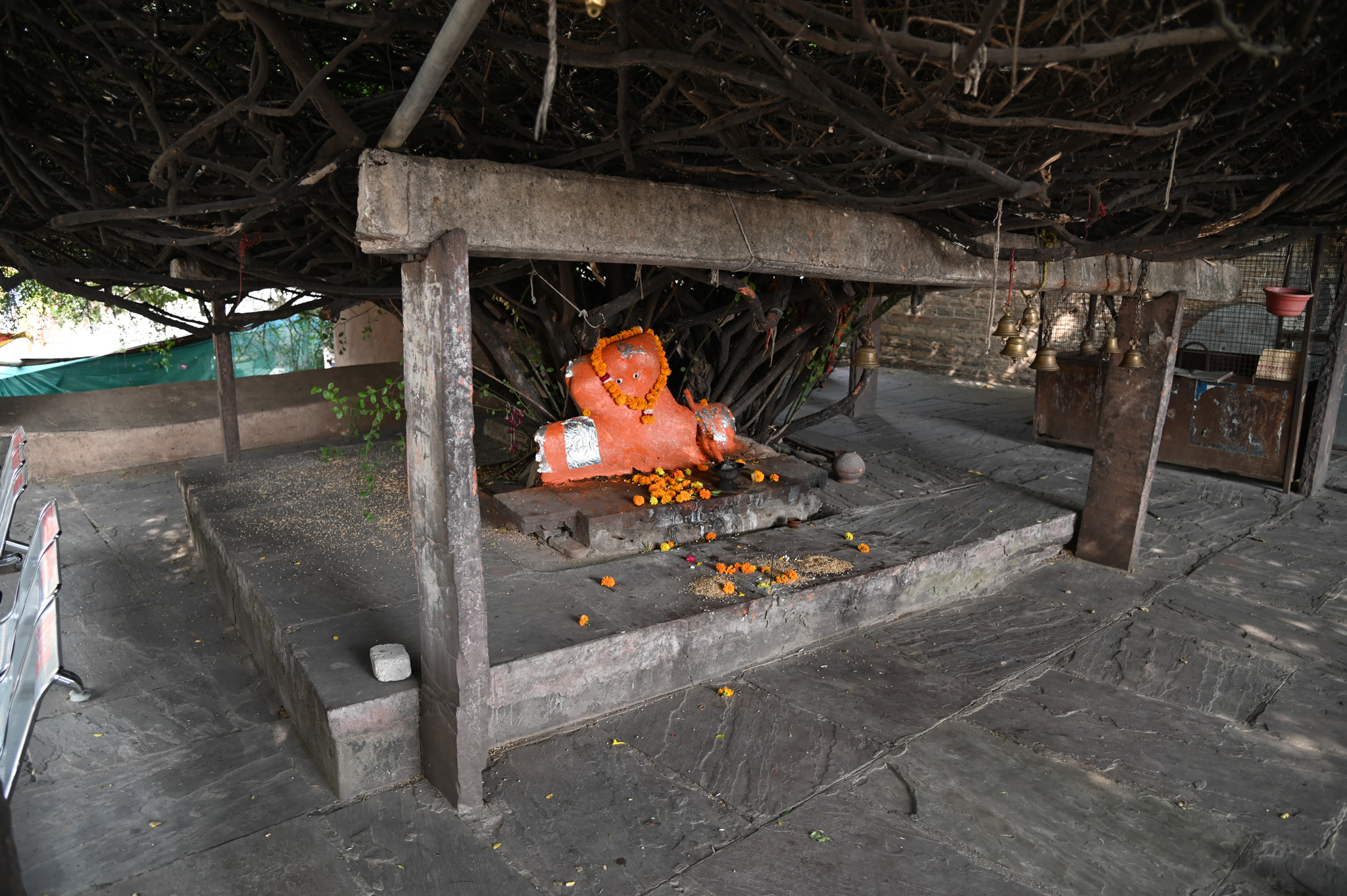 On the left side after reaching the top, is another small shrine situated on a stone platform beneath a thick tree. The deity revered as Hanuman, is covered in vermilion and is worshipped regularly by the devotees.