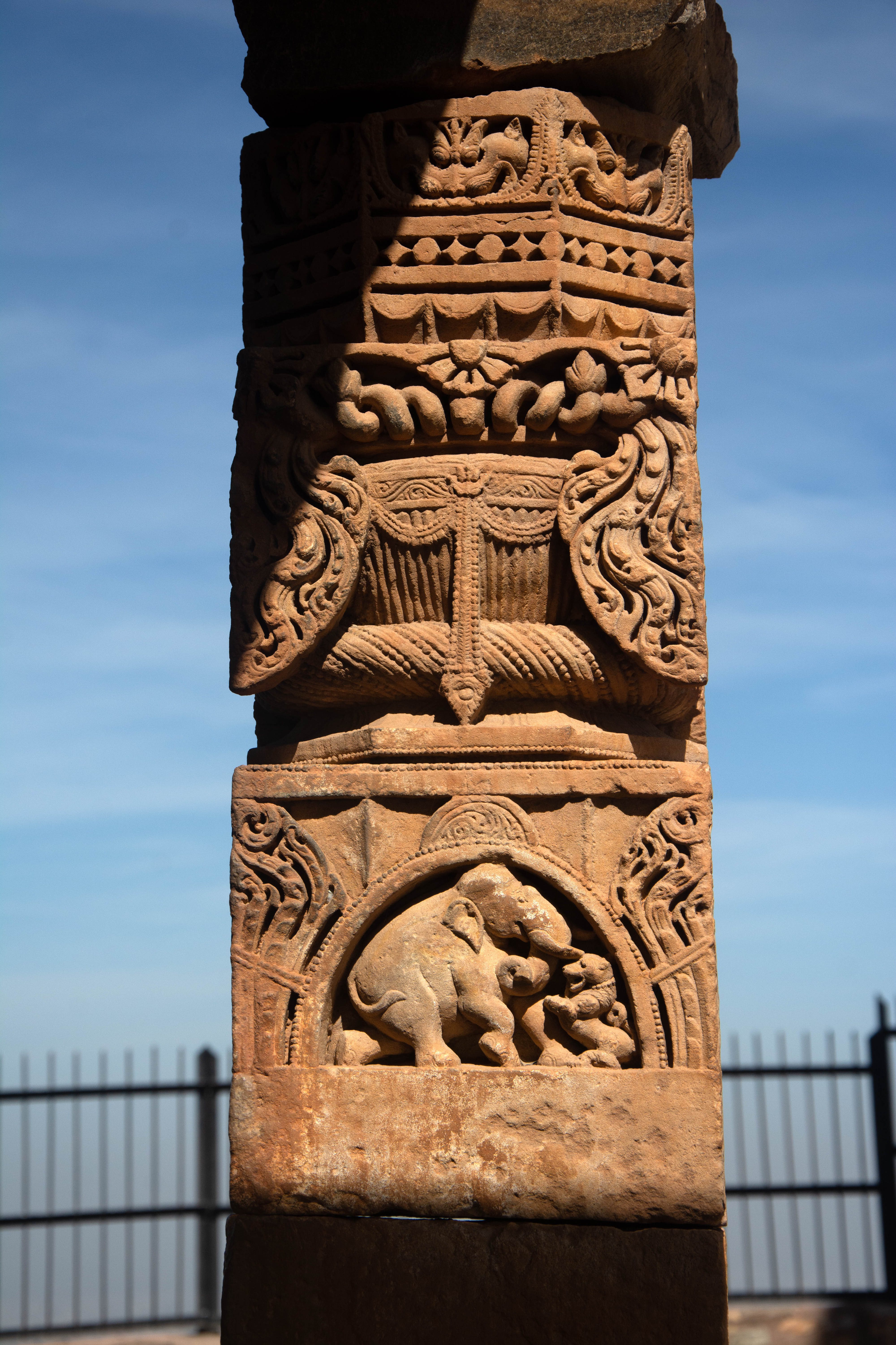 The ghata-pallava pillar, showcasing remarkable craftsmanship, depicts a lion and an elephant engaged in combat.