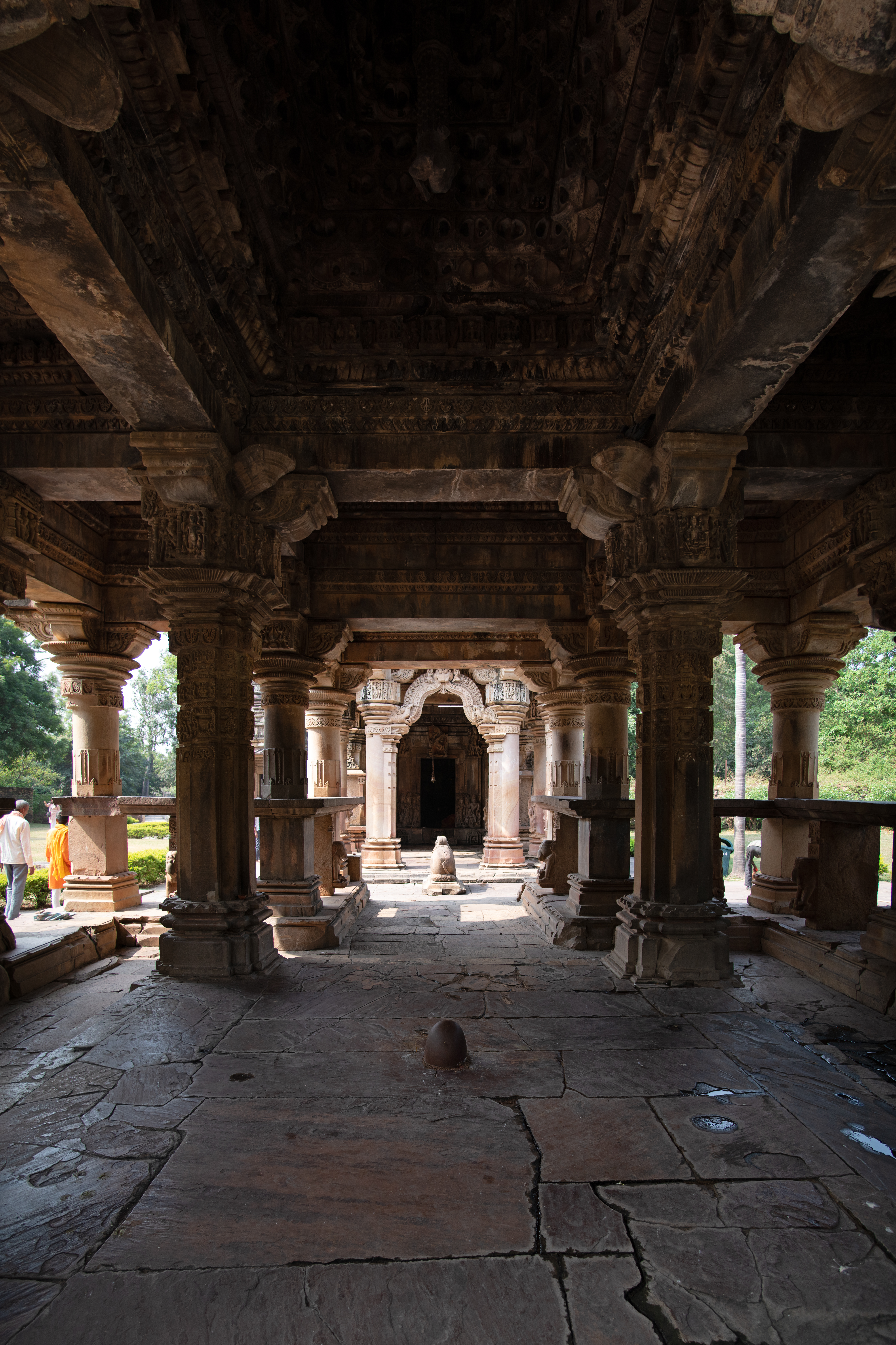 The rangamandapa (open type of pillared hall) is comprised of a multitude of heavy, ornately carved pillars that support the ceiling, crafted in two distinct styles. The outer pillars feature a square base which turns into faceted shapes and transitions into a circular shaft. in contrast, the innermost pillars maintain a square shape and display depictions of deities on the panels at the top, supporting the brackets. There is a Shiva linga at the centre of the hall.