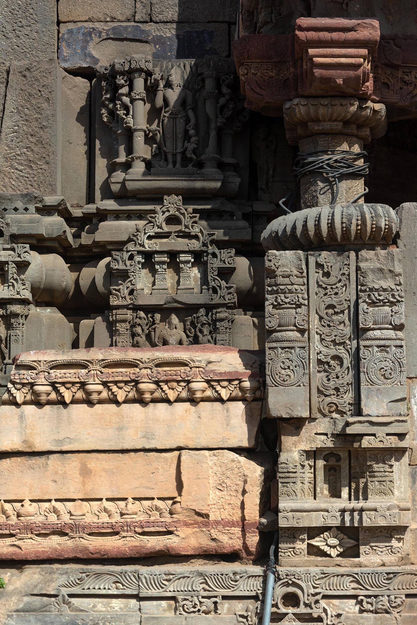 Debris from the original temple was salvaged when the current temple was reconstructed in the 1940s. These have been assembled in parts to form the jagati (raised platform). Different coloured stones are assembled here, some in pink sandstone and the rest in grey sandstone. However, it is not known where they were located in the original temple or if they came from multiple structures. The pink sandstone has floral designs with Stupa (dome-shaped memorials, made on the holy relics of the Buddha) motifs. The grey sandstone has the padma (lotus), the purna ghata (overflowing pot of prosperity) and the kalpa lata (creeper) motifs. The God of fire, Agni, is visible in the background (top), placed in the southeast corner of the garbhagriha as a dikpala (guardian of directions) of the southeast direction.