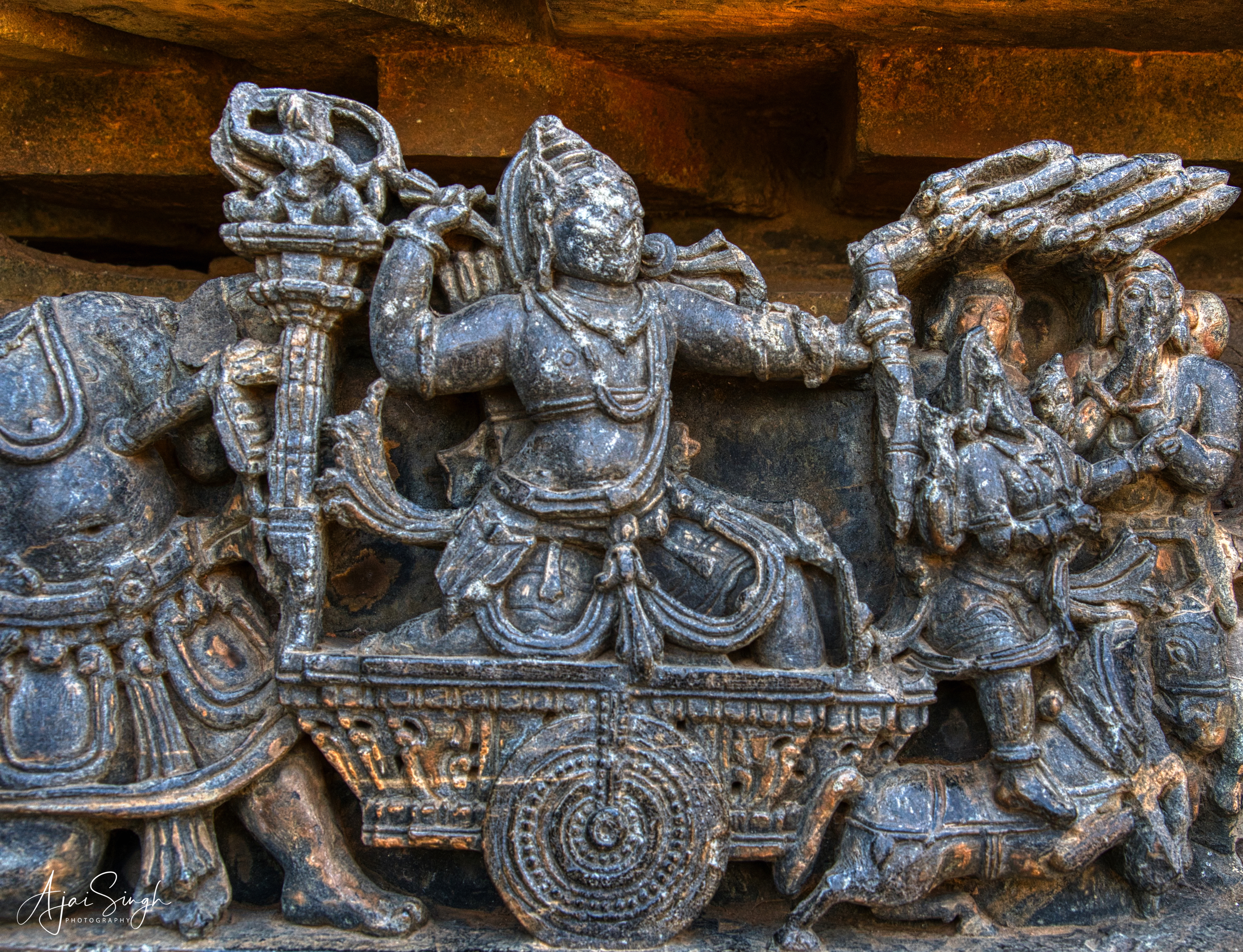 [ Arjuna is shown drawing an arrow from his quiver in the midst of the Mahabharata war. Hanuman can be seen sitting atop his chariot, providing protection to it. ] [ Image courtesy: Brig A.P. Singh - www.collectingmoment.in ]