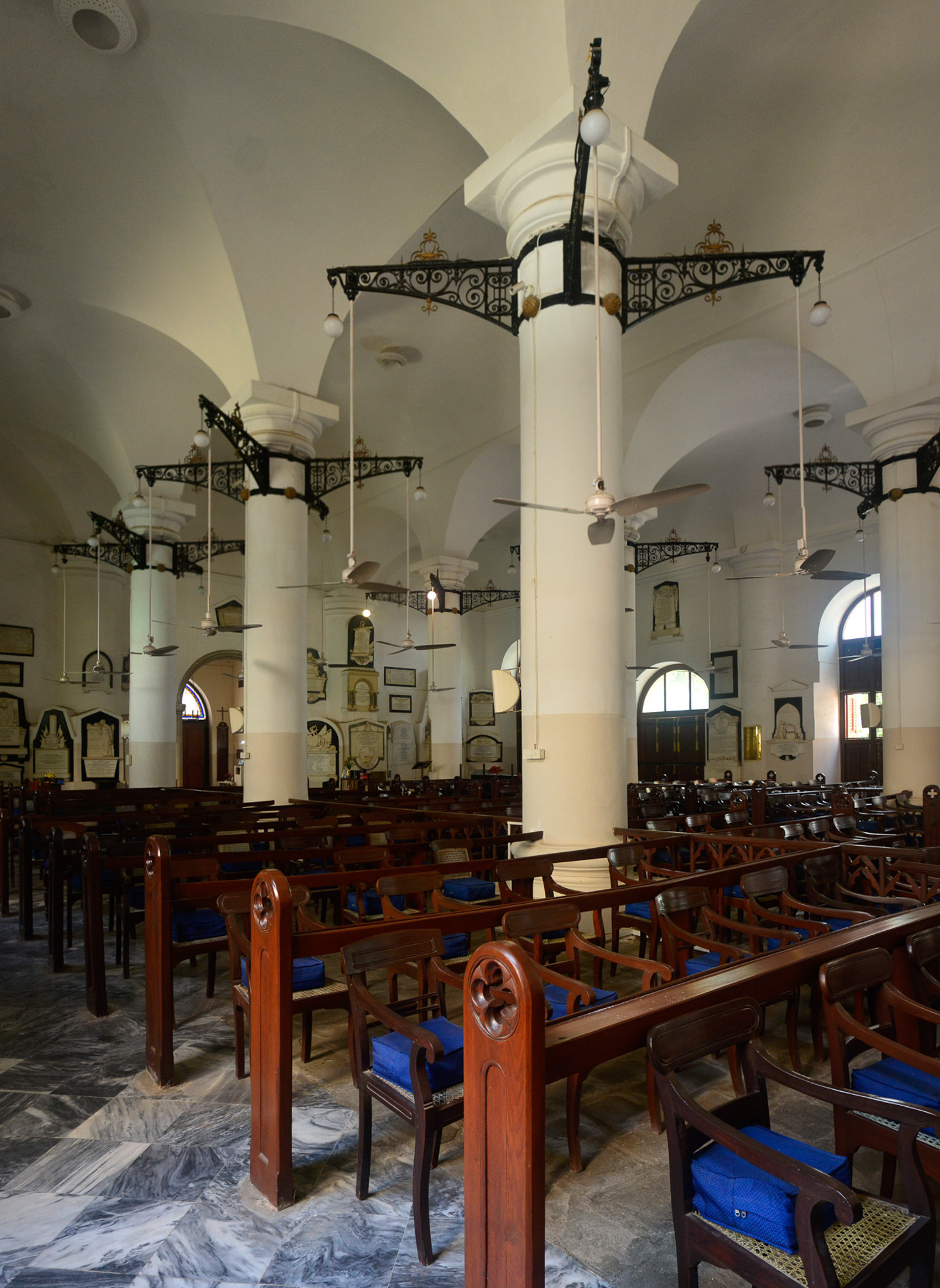 Over the years, St. Thomas Church has been upgraded with the change in technology and the need for improving public convenience. For example, wrought iron brackets were fitted to the pillars when electricity was introduced for the first time in 1907. Fans and lights hang from the ends of each bracket, providing comfort to the congregation assembled in the hall.