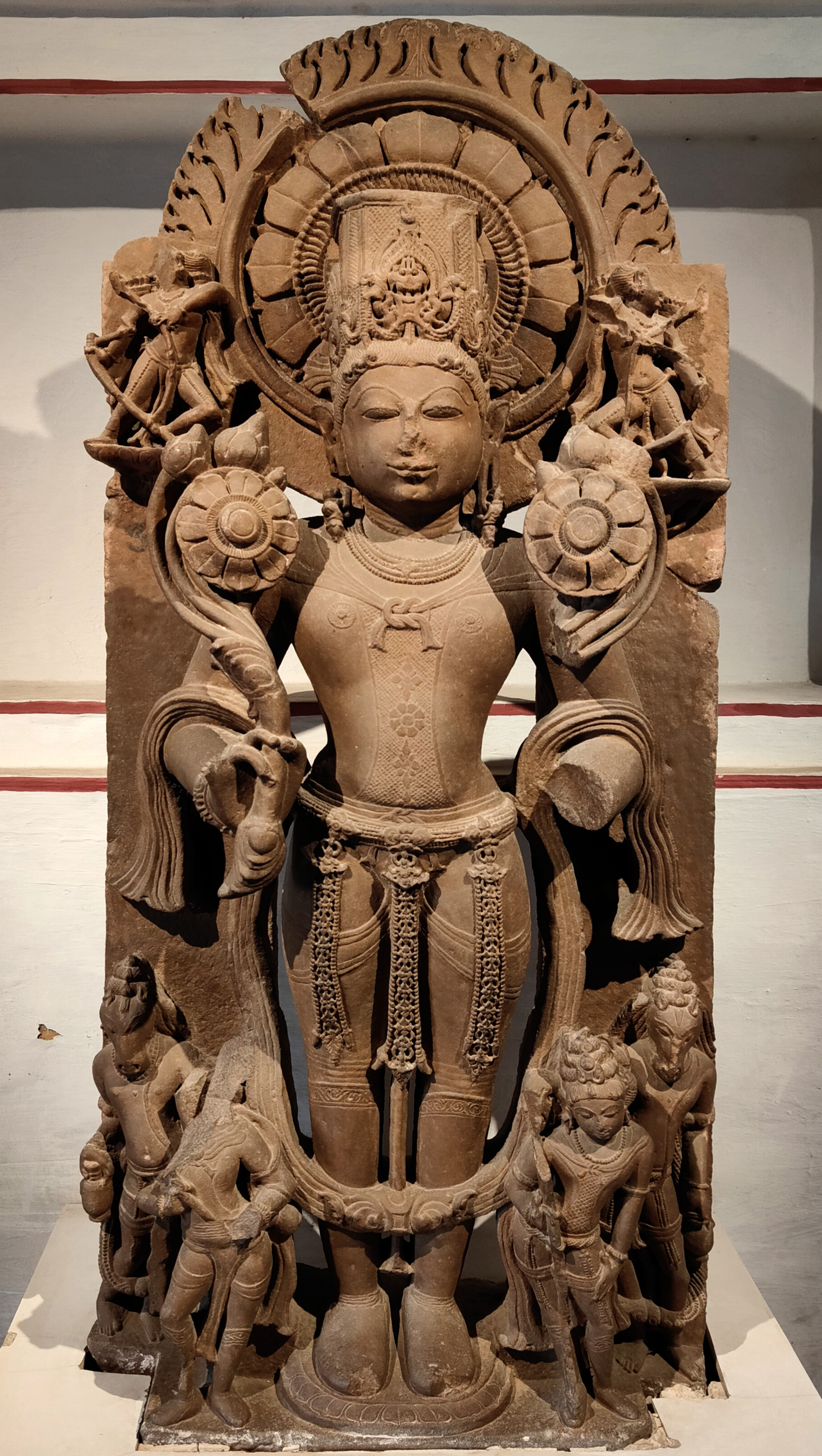 This majestic image of Surya, now in the Akbari Fort and Museum in Ajmer, must have once been placed inside the sanctum of a lost Surya shrine. Coupled with multiple other Surya images at the shrine (Surya, Chhaya, etc.), it suggests the maturity of the Surya tradition at the hill, present there at least from the 8th century CE, much before the emergence of the Harshadeva-Shiva as the royal shrine at the hill. He is holding two fully bloomed-lotuses in either hand. He is flanked on either side by his companions, Danda and Pingala, positioned immediately near his legs, with the pair of the horse-faced Ashvin brothers at the back. On the above register is an elegant pair of bow holders about to unleash the arrow. Surya is wearing the kirita-mukuta, and the radiant halo in the form of a fully bloomed lotus appropriately suits the radiant glow of the Sun God. Surya is wearing the kirita-mukuta, and the radiant halo in the form of a fully bloomed lotus appropriately suits the radiant glow of the Sun God. Image courtesy: Akbari Fort and Museum, Ajmer