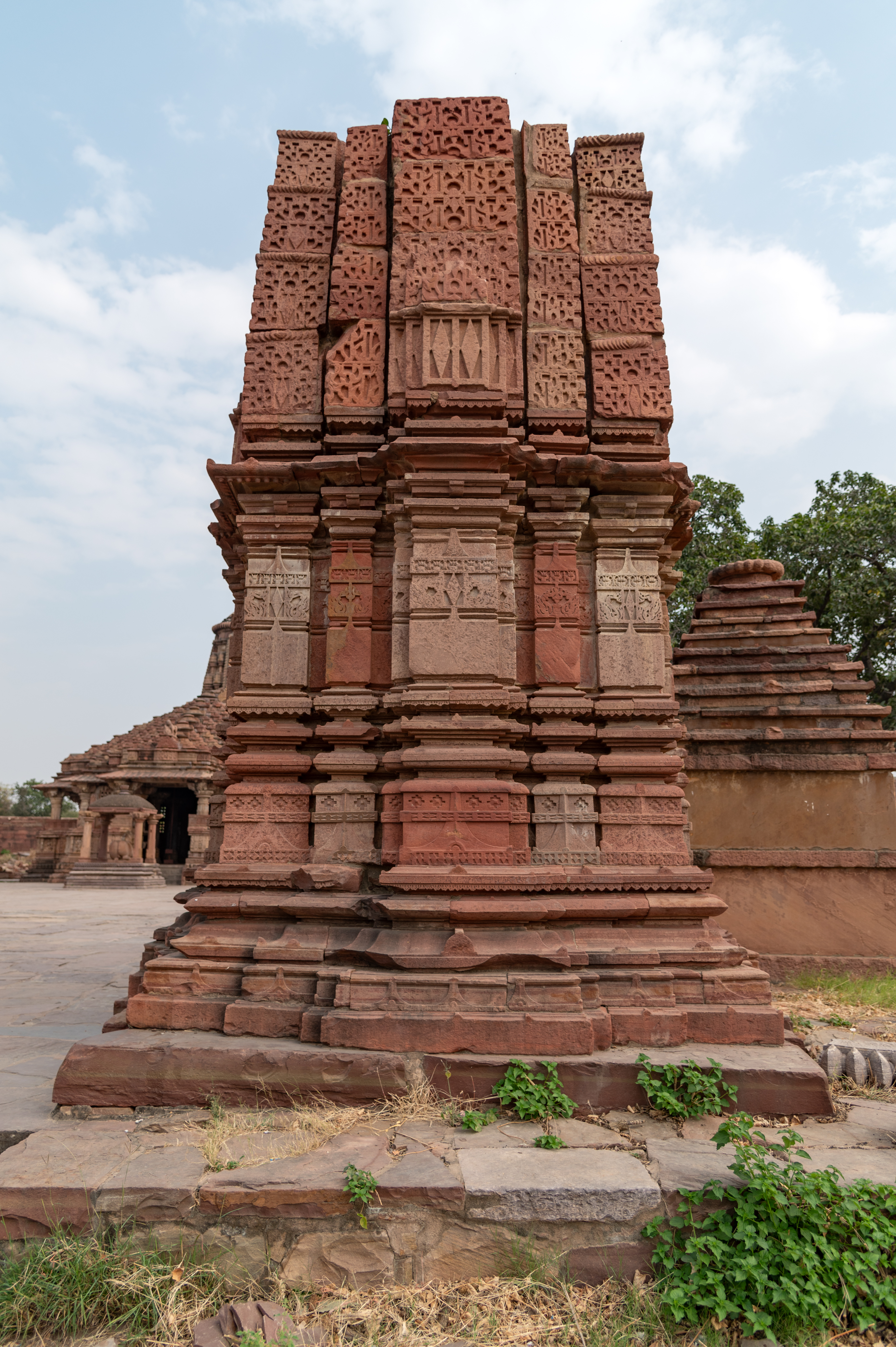 This is a single-shrine temple with a latina-nagara shikhara (mono-spire superstructure) next to the pratoli (entrance gateway), in the row of temples that are along the western boundary of the Mahanaleshwar temple complex. The central band of the shikhara (superstructure) is broader than the rest. The corner bands have karna amalakas (aedicules made of gavaksha or dormer window designs and separated by slender fruit-like ribbed discs). The temple is a simple construction, not austere in appearance and has lost the topmost portion of its shikhara. Latina shikhara in which the central band of the shikhara (superstructure) is broader than the rest. The corner bands have karna amalakas (aedicules made of gavaksha or dormer window designs and separated by slender fruit-like ribbed discs).