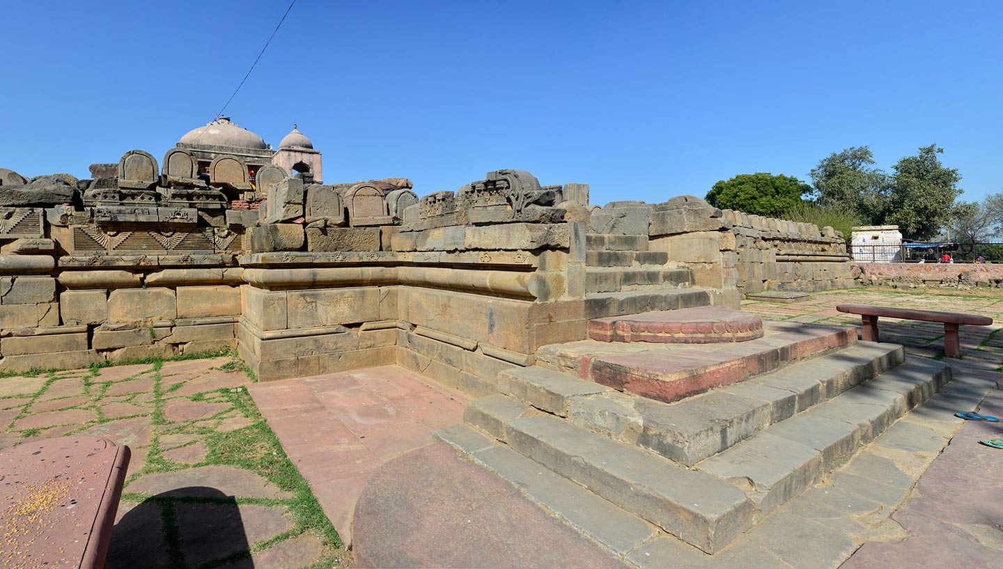 Broken fragments and debris from the original temple assembled on the adhisthana on the southeast side. The adhisthana has a chandrashila (moonstone) on the third step. The moonstone is a hemispherical stone in the shape of the moon placed at the entrance of Hindu temples and is designed to resemble a lotus flower.