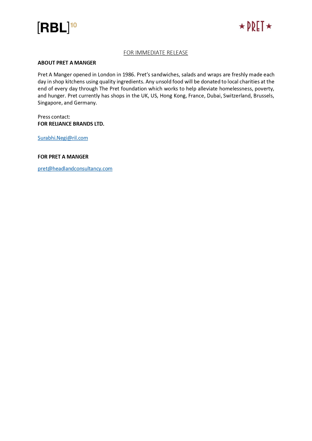 Reliance Brands announces first foray into food and beverage retail with Pret A Manger Public Deposited