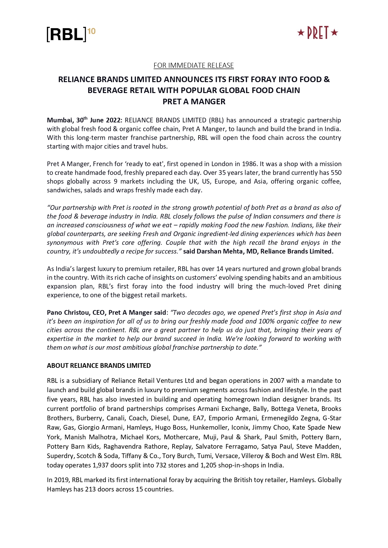 Reliance Brands Limited announces its first foray into food and beverage retail with popular global food chain Pret A Manger. Image Courtesy: Reliance Industries Limited.