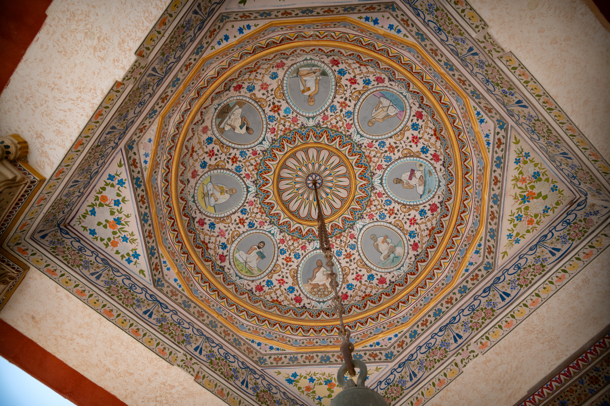 Ceiling of the mukhamandapa (front porch) of the Bhandasar Temple. The innermost circle eight paintings of Jain monks and other parts of the ceiling are adorned with floral motifs. The figure in these paintings is shown wearing a white loin cloth and upper garment, sitting in a yogic posture.