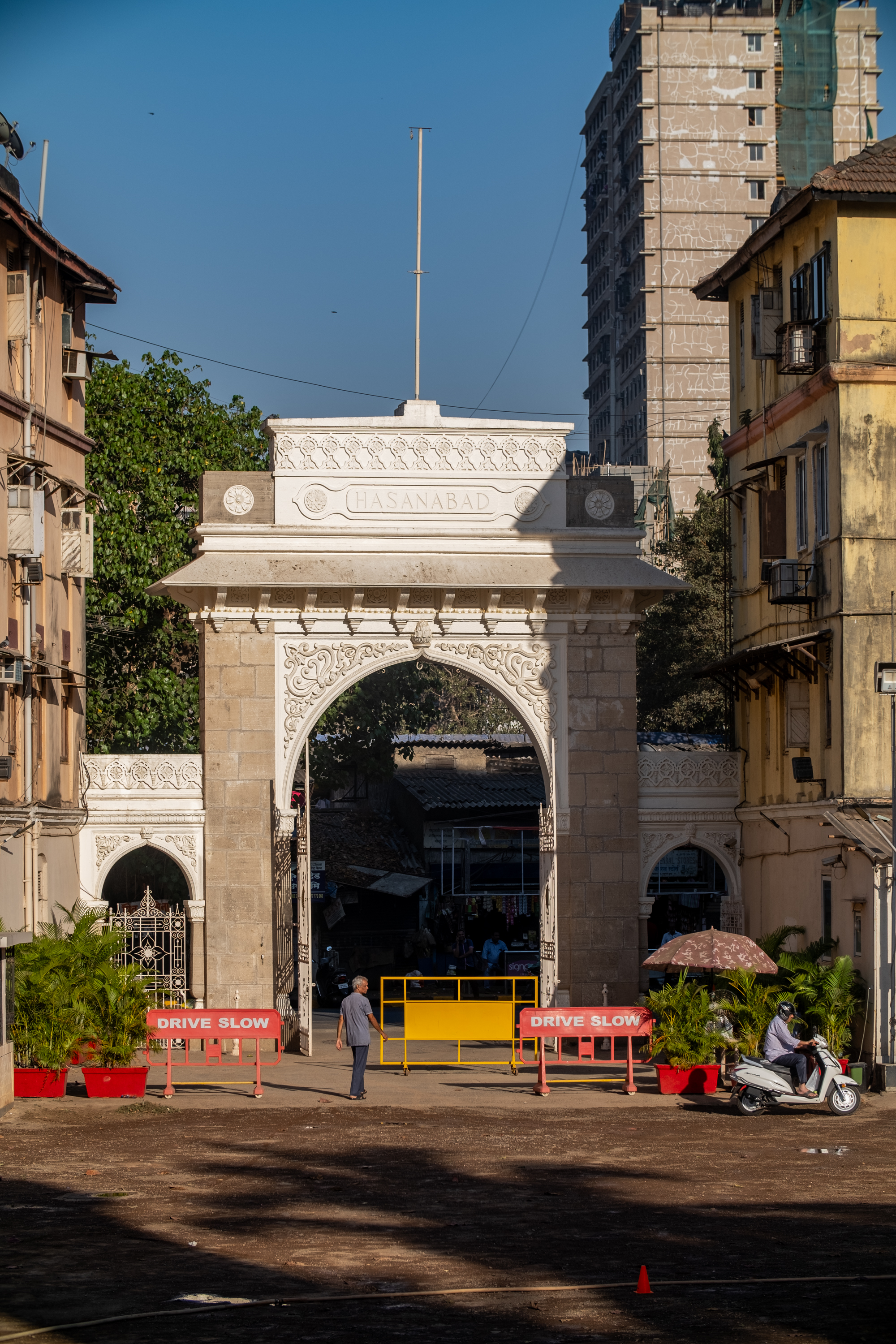 The main entrance to the Aga Khan Maqbara complex is accessed through a gateway on Dr Mascarenhas Road. Previously known as Eden Hall, it was renamed Hasanabad (inscribed at the entrance) in memory of Hasan Ali Shah, officially titled Aga Khan I.