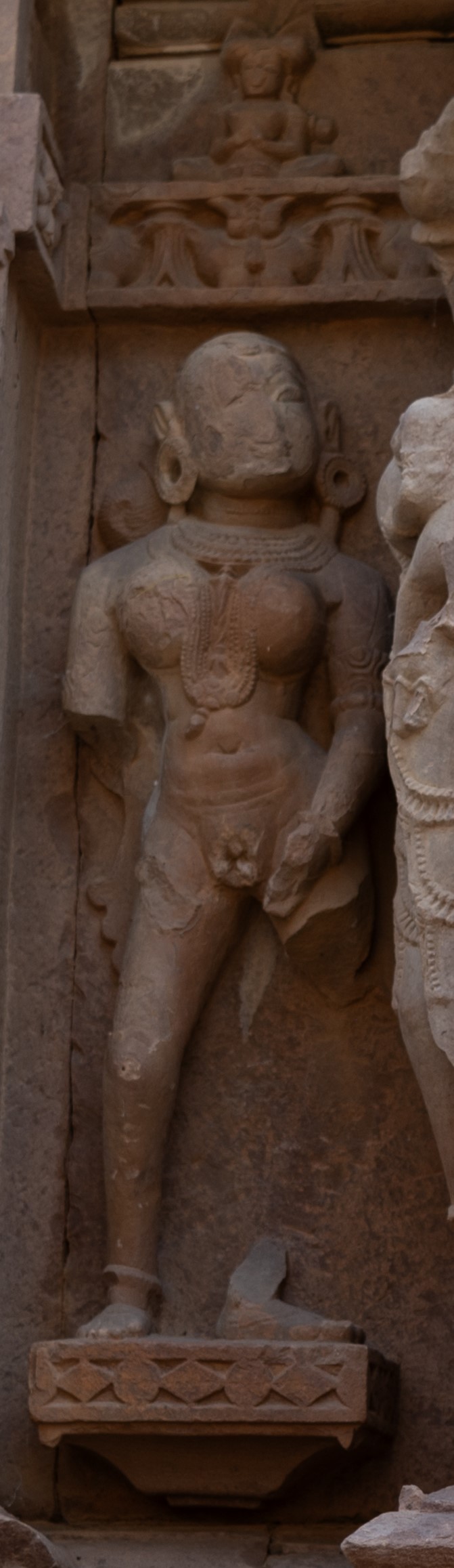 On the northern wall, there is a depiction of a surasundari (celestial damsel) an elaborate hairdo, fashioned into a bun. She stands tall and slender, bedecked with substantial jewellery. One of her hands is fractured, while the other rests near her exposed reproductive organ. It is worth noticing that both ascetic and surasundari are shown with their revealed genitalia, they both represent different natures and stand for opposite symbolism.