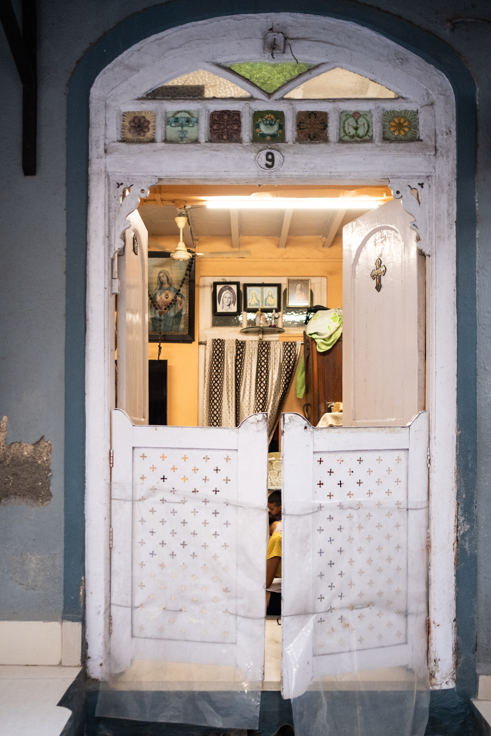 This old home, at 9 Matharpacady, has batwing doors (double swinging doors) at the entrance, preserving its historical character and charm. The lintel above the door is decorated with colourful tiles with floral motifs, each different from the rest.