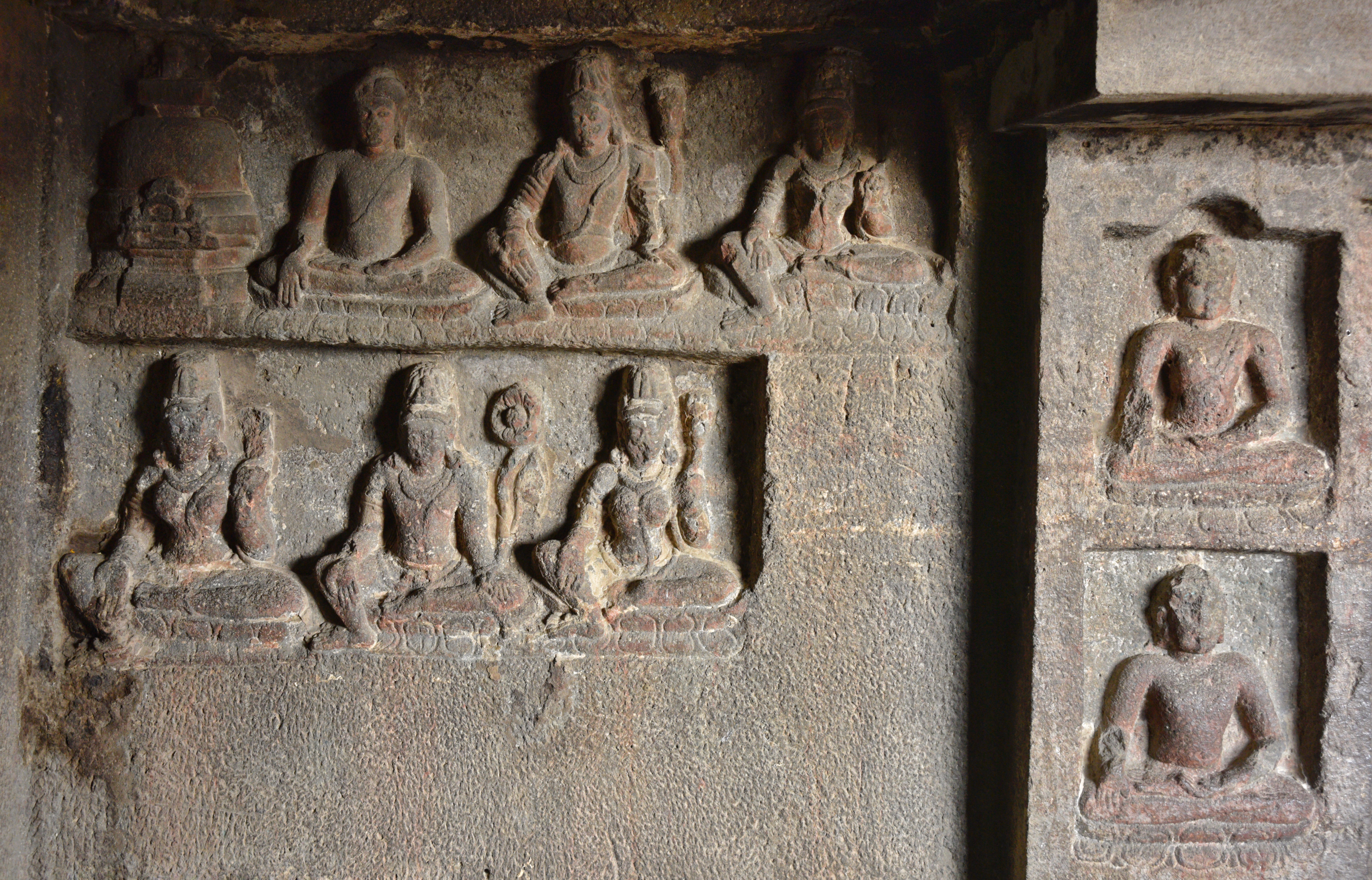 Ellora, Buddhist Architecture, Buddha in Bhumisparsh mudra with Stupa and other divine figures Público Deposited