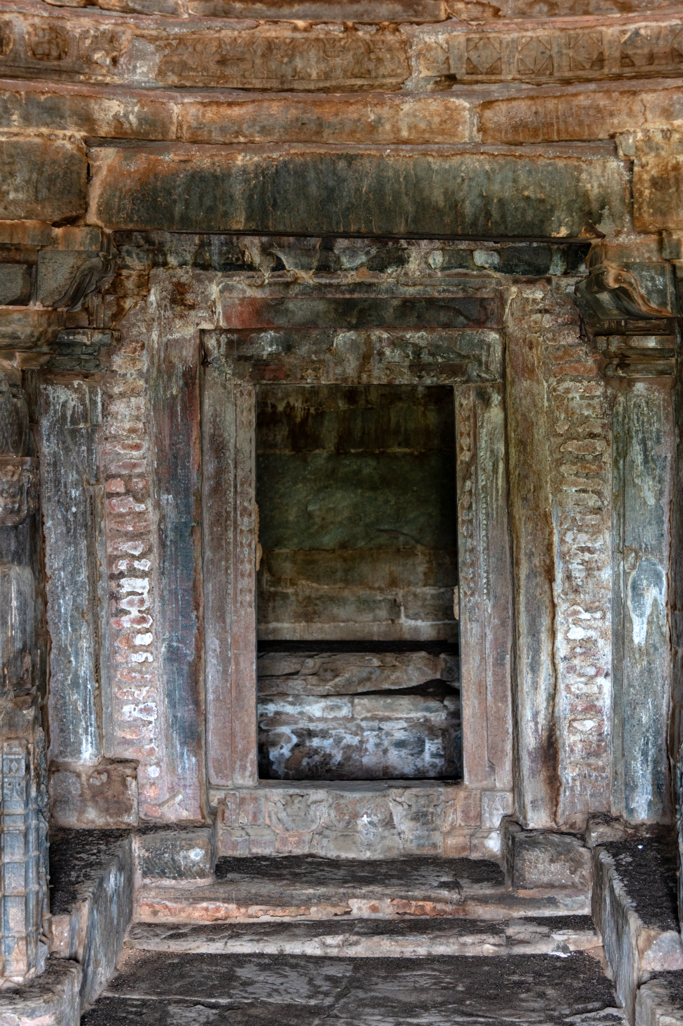 A closer view of the entrance into the garbhagriha (sanctum sanctorum) of the Jain Temple is defined by a simple dvarashakha (door jamb) which has been renovated with bricks. The garbhagriha of the temple is currently empty. The original object of worship is not known and currently too the temple is not under worship.