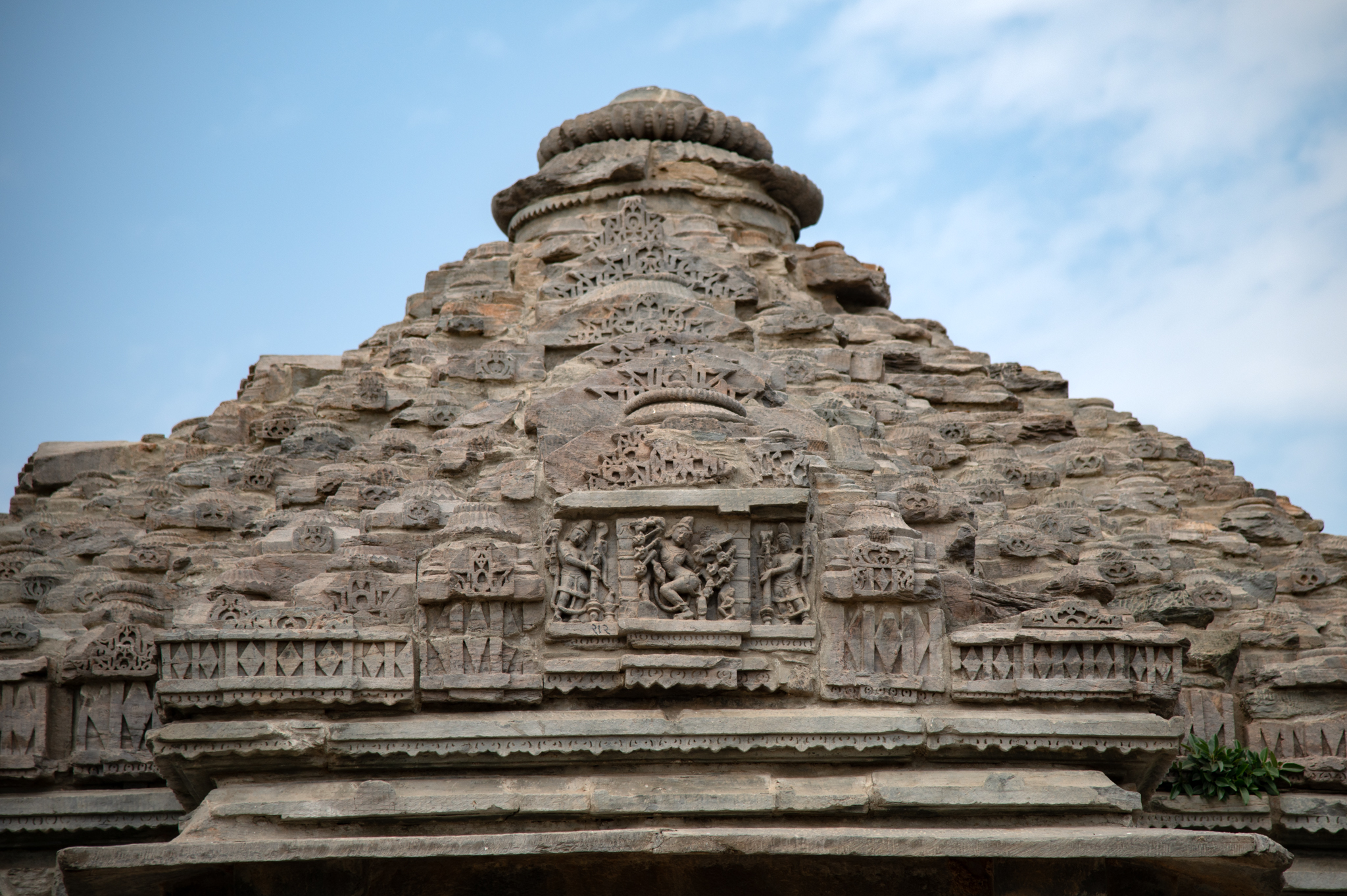 Closer view of the shikhara (superstructure) of the mandapa (pillared hall) of the Shiva temple. This shikhara is of the ghantasamvarna (bell roof) variety of a pyramidical nature. It is made up of several small ghantikas (bells) that have chaitya dormer motifs on their pedestals. These aedicules are arranged in such a manner that they appear cascading from top to bottom.