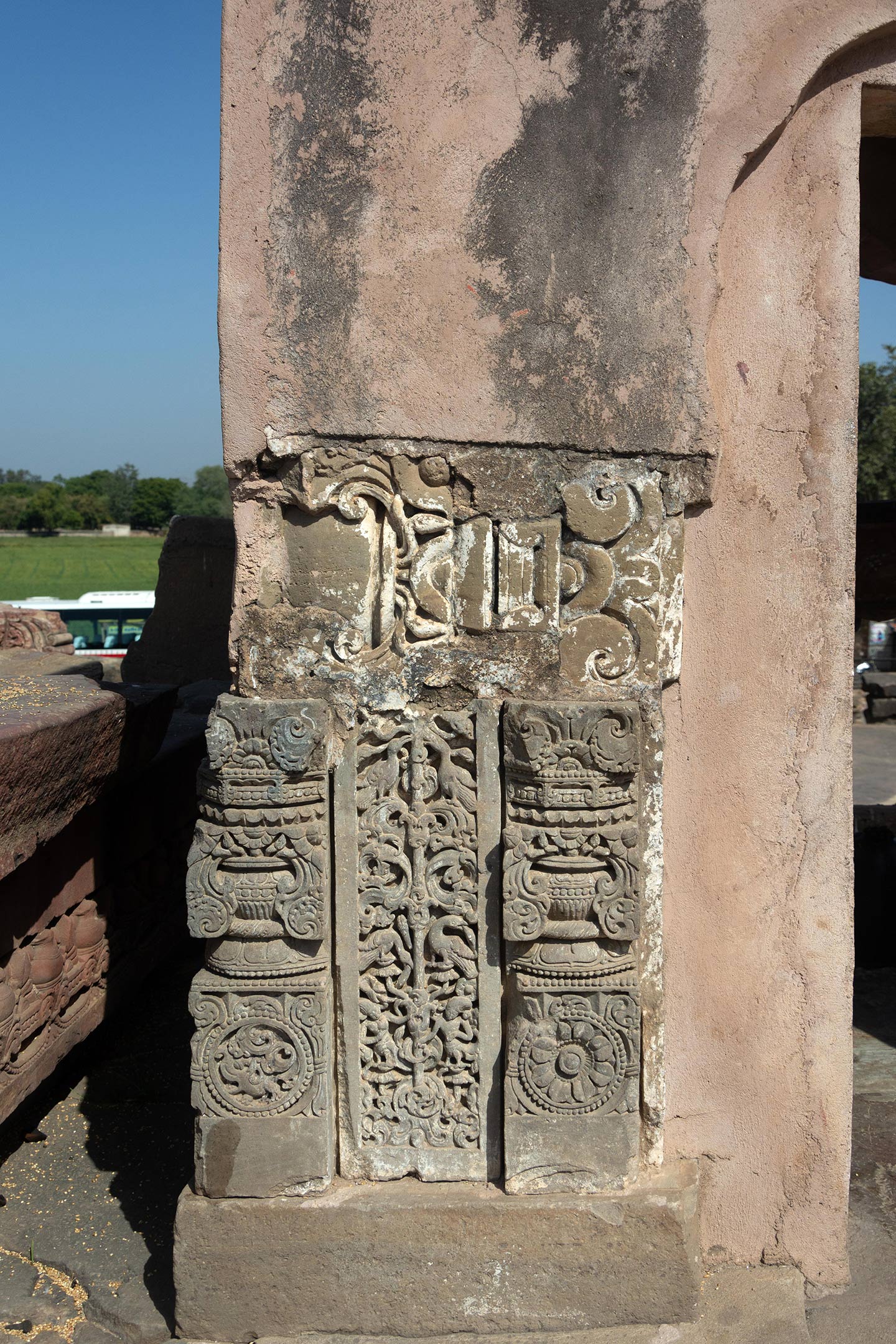 A small shrine, possibly a newer construction, is placed off-centred to the right facing the garbhagriha. Further steps lead to the third level, on a projected platform. Pieces from the temple have been repurposed in this shrine. The stone is broken and has three vertical sections. The section on the left has a purna kalasha (overflowing pot of prosperity) motif on the upper half and a makara (hybrid sea creature) inside a circular medallion at the bottom half. The mid-section has an intricate carving of kalpa vrisksha (tree of life) motif with figures of birds and kinnaras (hybrid human-bird creatures) camouflaged within the foliage. The section on the right has a purna kalasha motif on the top half and an eight-petal lotus blooming inside a circular medallion at the bottom half.