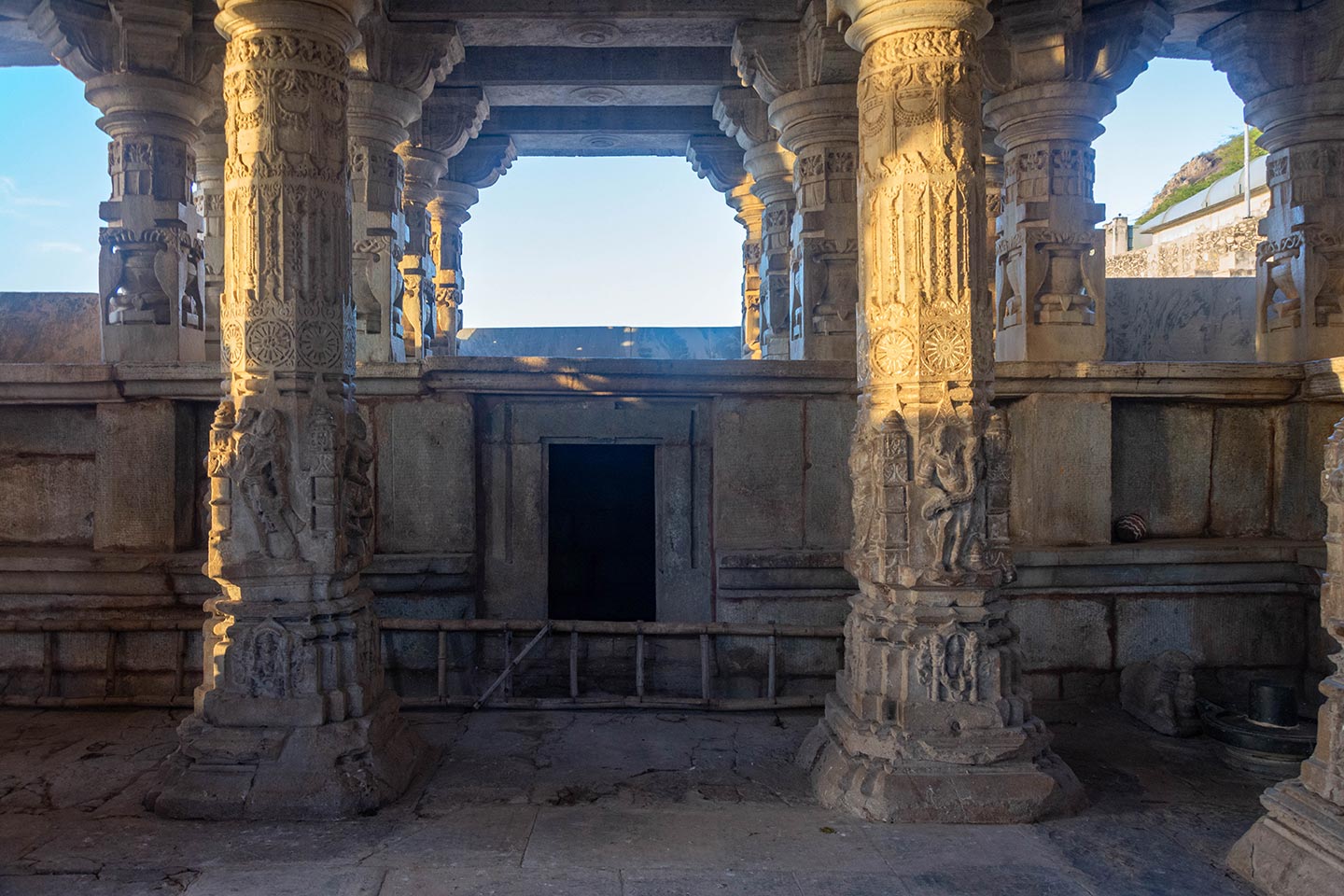 Each lateral transept of the mahamandapa (pillared hall) contains a cell with a flat ceiling, currently vacant. The cells feature a flat roof and a doorway.