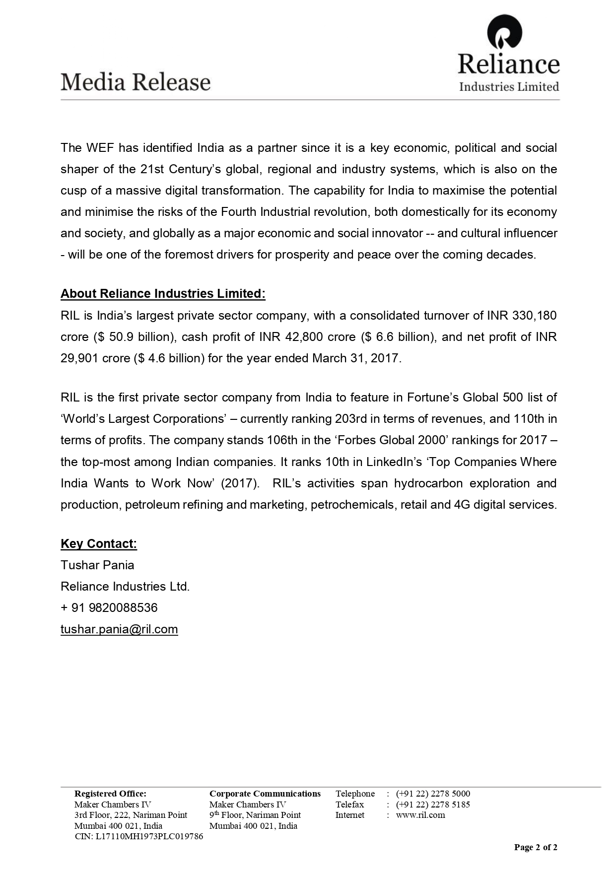 World Economic Forum sets up Centre for the Fourth Industrial Revolution in Mumbai – in partnership with Reliance Industries Limited. Image Courtesy: Reliance Industries Limited.