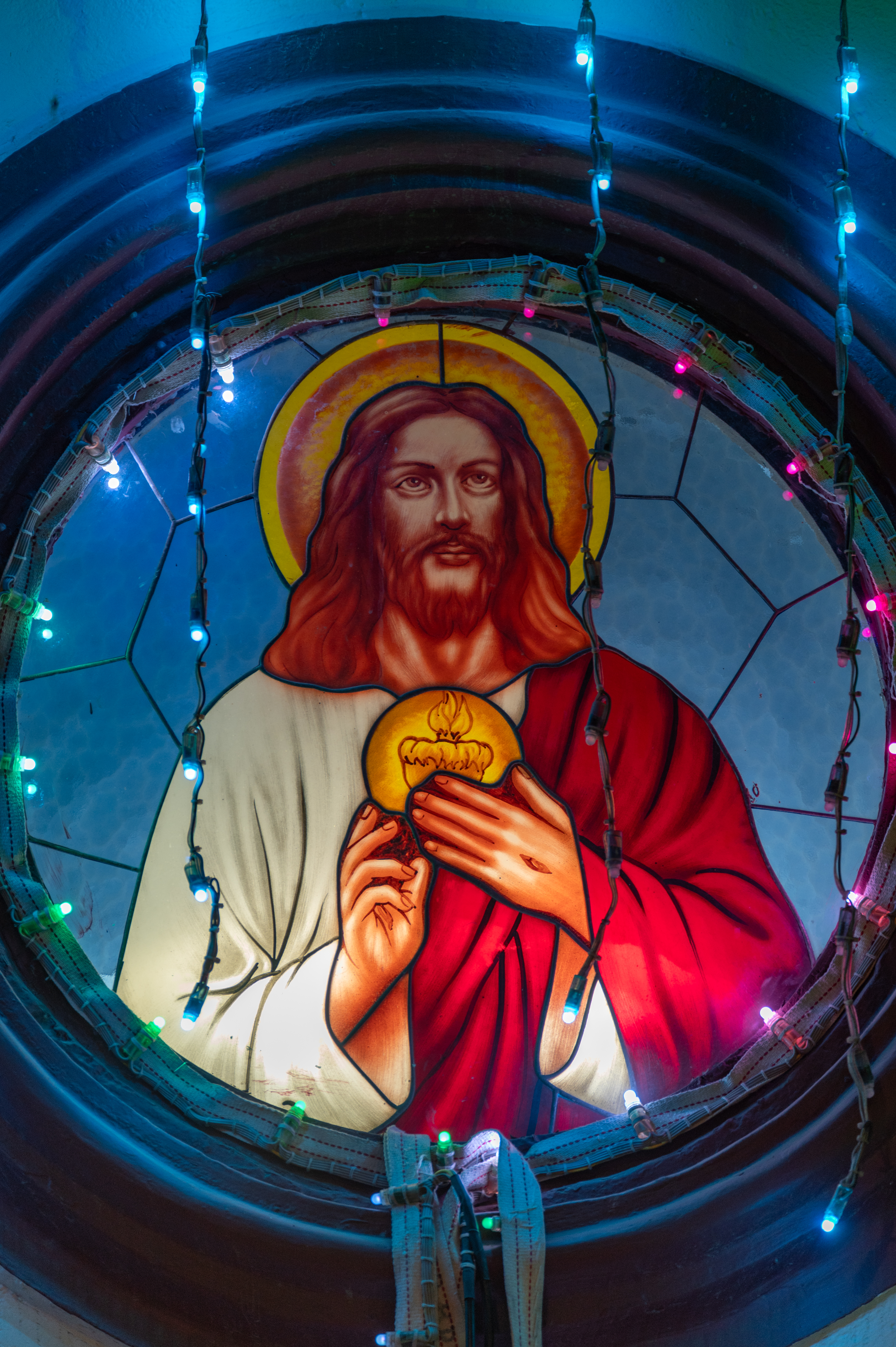 The patron saint of the Holy Cross is St. Roch, who is especially invoked against plague, cholera, and epidemics. Traditionally, every year, the Managing Committee of the Holy Cross Oratory organizes the nine-day Novena Services, which are held in the late evening from April 22 to April 30. This is the stained glass portrait of Jesus Christ on the rose window of the chapel, illuminated during Christmas.