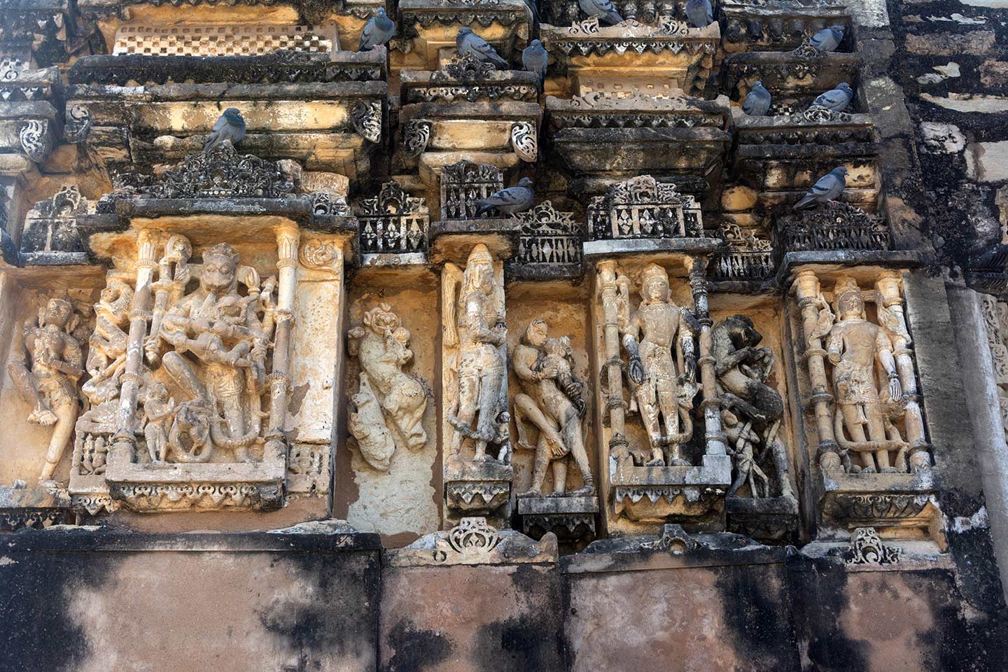 This is the north-facing elevation of the central shrine in the Neelkanth Mahadev Temple. The central bhadra (central projection) has a depiction of Narasimha killing the demon Hiranyakashipu. The recesses have vyala (composite mythical creatures) and mithuna/maithuna (amorous couples) figures.
