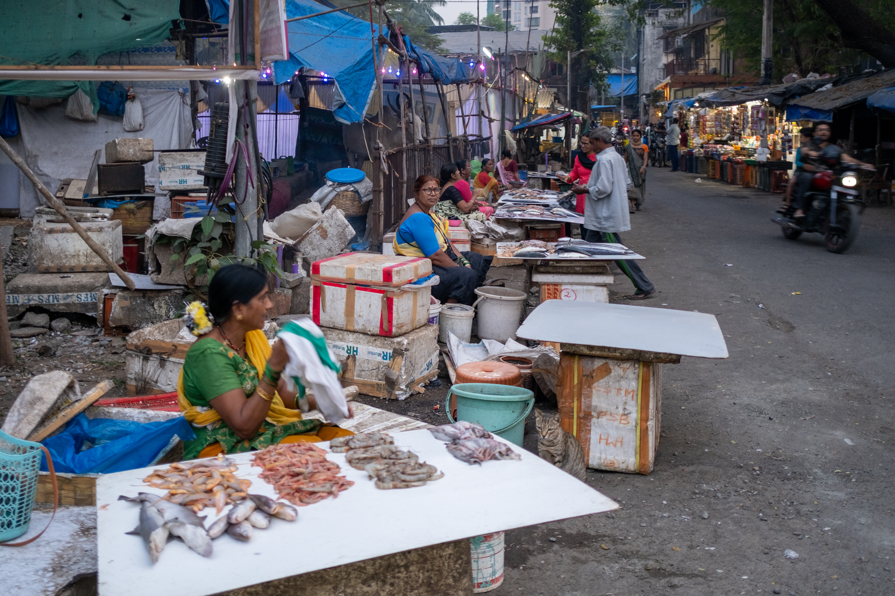 Historically, Koli women used to sell fish caught from nearby water bodies like the Mithi River. Today, most of these water bodies are either heavily polluted or have been developed over, making the fishing business unsustainable. The majority of fish sold in local markets now comes from wholesale markets in South Mumbai.