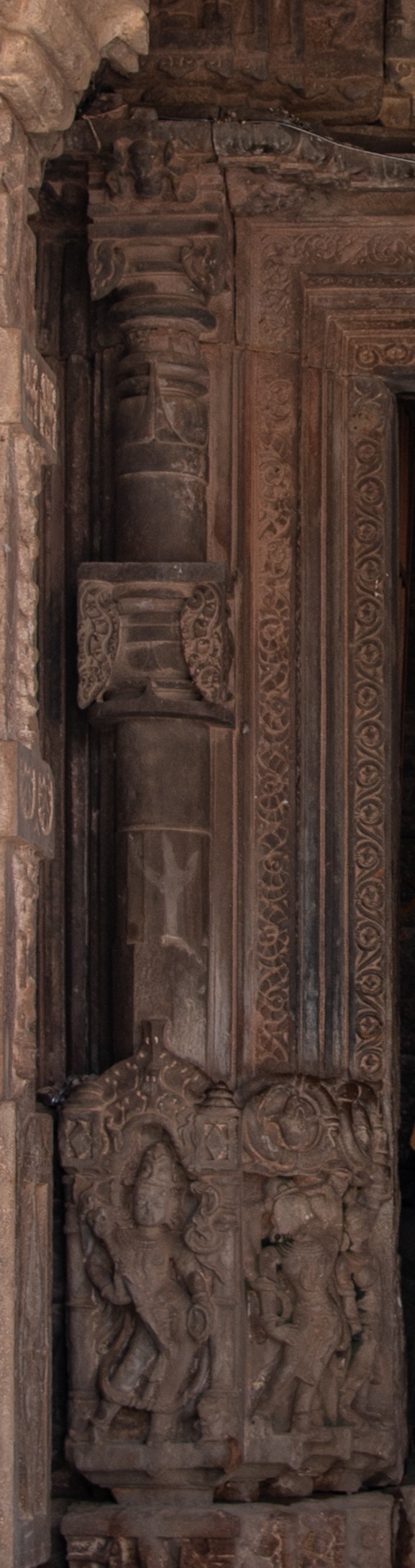 The doorframe of the garbhagriha (sanctum sanctorum) has two floral shakhas (vertical bands or branches), a central dominant stambha shakha (pillar-shaped branch) with a purnaghata kalasha (vase and foliage), and an outer shakha adorned with vyalas (composite mythical creatures) arranged in a vertical chain.