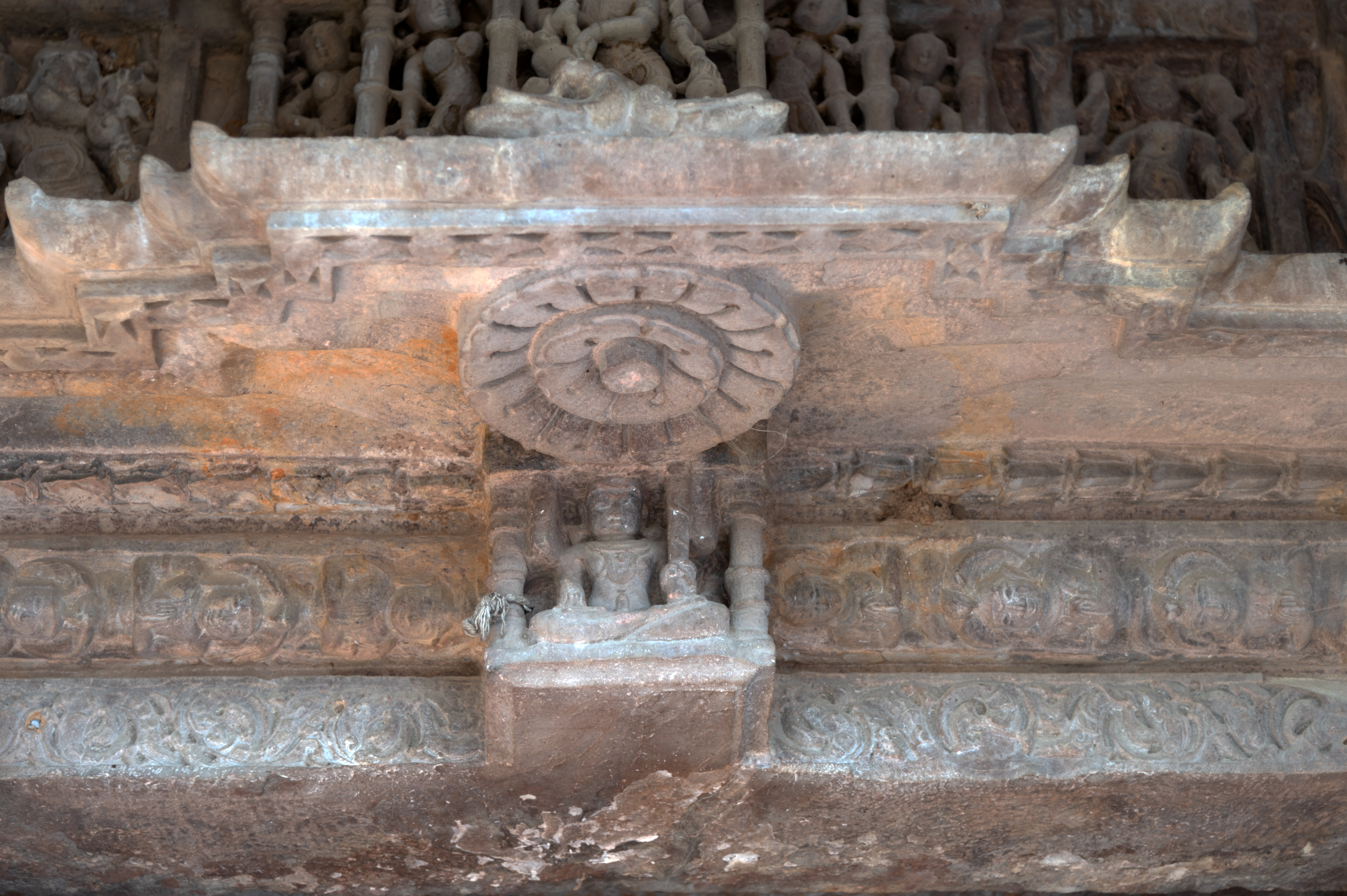 The lalatabimba (lintel) of the garbhagriha (sanctum sanctorum) has an image of Lakulisa—a preceptor of the doctrine of the Pashupata tradition of Shaivism—seated in padmasana (lotus pedestal pose). He is shown with an erect phallus, holding a lakuta (staff) in his left hand and a beejapurak or phala (fruit) in his right hand.