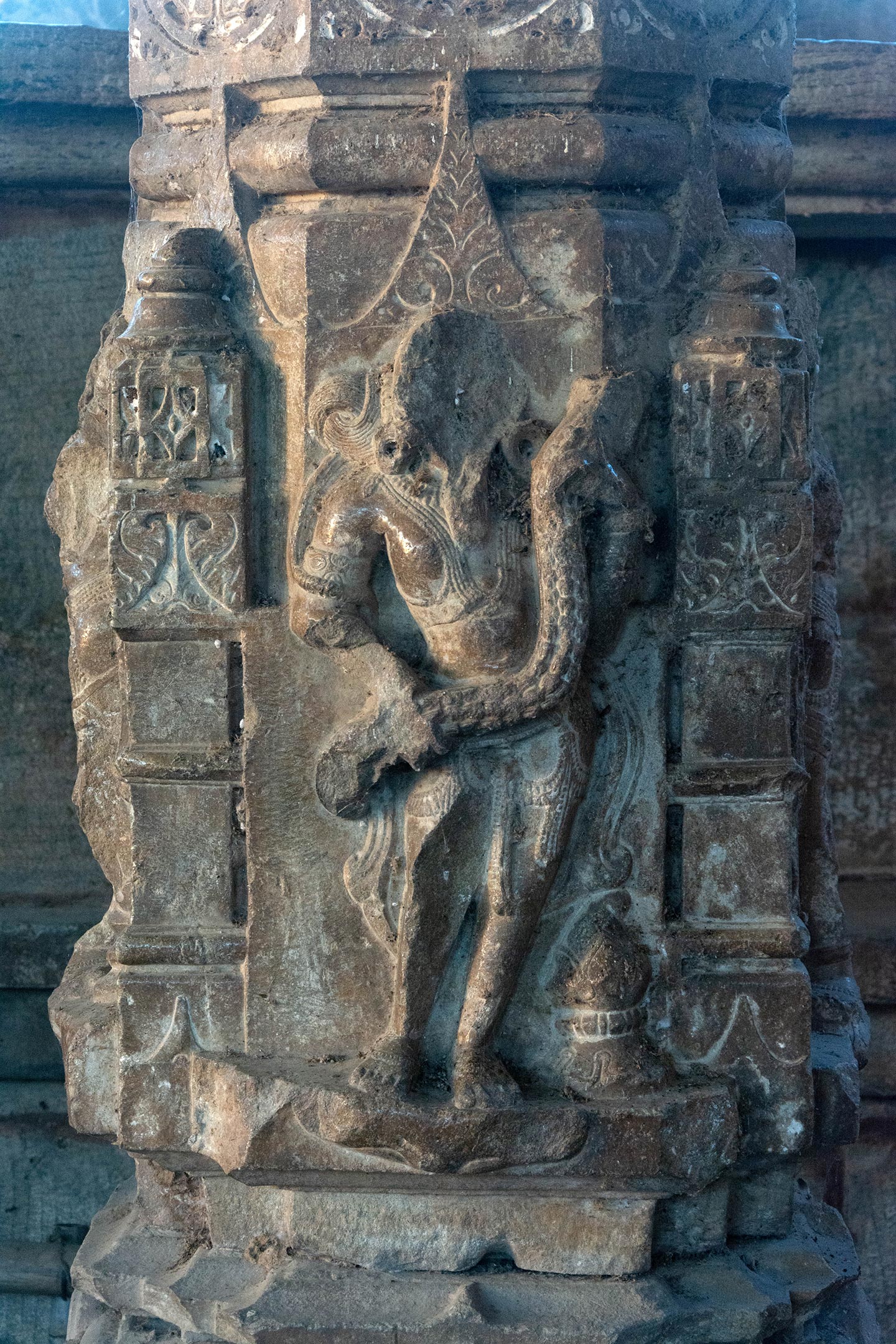 A heavily bejewelled royal figure holding a garland is depicted on one of the pillars of the mahamandapa (pillared hall). While one might speculate that this figure could be representing the patron king, Vigraharaja IV, there's no conclusive evidence to support this theory.