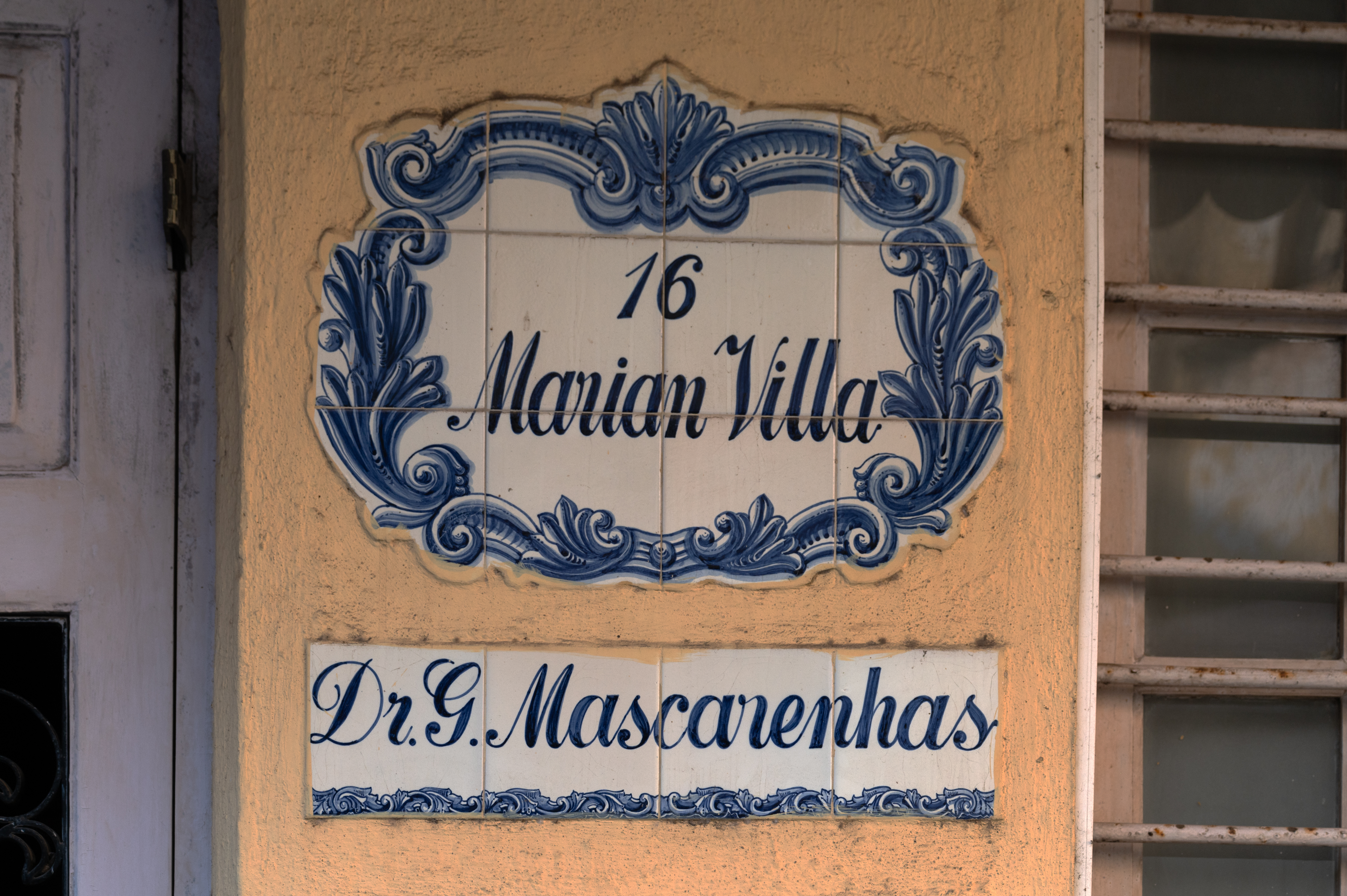 Marian Villa is among the better-preserved Portuguese-style bungalows in Matharpacady, home to the Mascarenhas family. Azulejo tiles are used for the nameplate, similar to those used in Goan homes. Arabic in origin, these blue and white tiles were produced by the Spanish from the 14th century onward to decorate their churches and monasteries. The Portuguese imported the tiles from Spain and, in the 17th century, started exporting them to their colonies, from where they reached Goa.