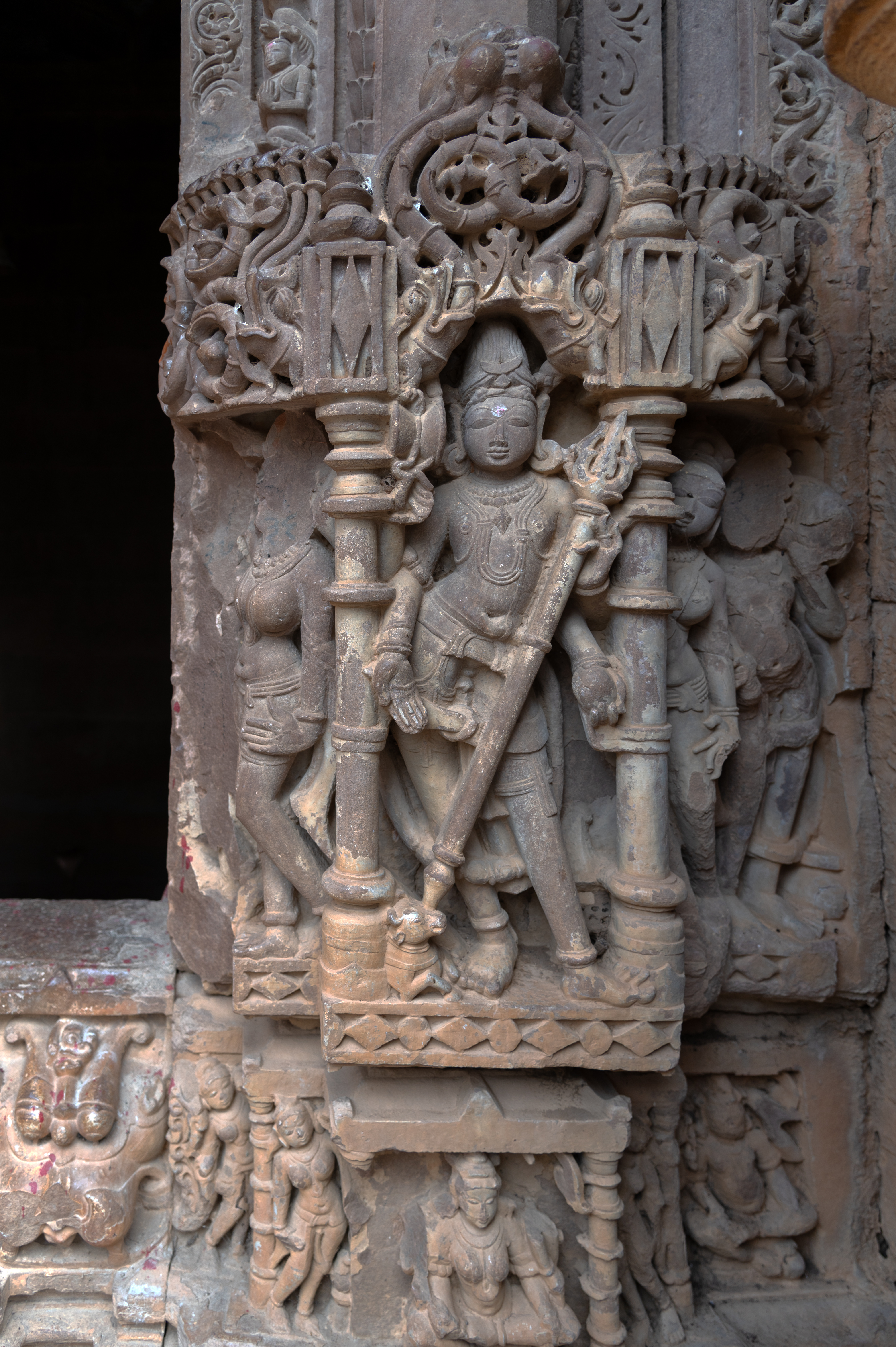 The depiction of Shiva on the left side dvarashakha (vertical band) of the garbhagriha (sanctum sanctorum) in the Kaner-ki-Putli Temple is depicted with four arms. He holds a trishula (trident) and damru (hourglass-shaped drum) in his upper hands. In the lower left hand, he holds a beejapurak (fruit), while his lower right hand is in the varada hasta (boon-granting) gesture. He wears a jatamukuta (a crown of matted hair) adorned with a crescent moon at the centre. Seated at the bottom right is a depiction of Nandi.