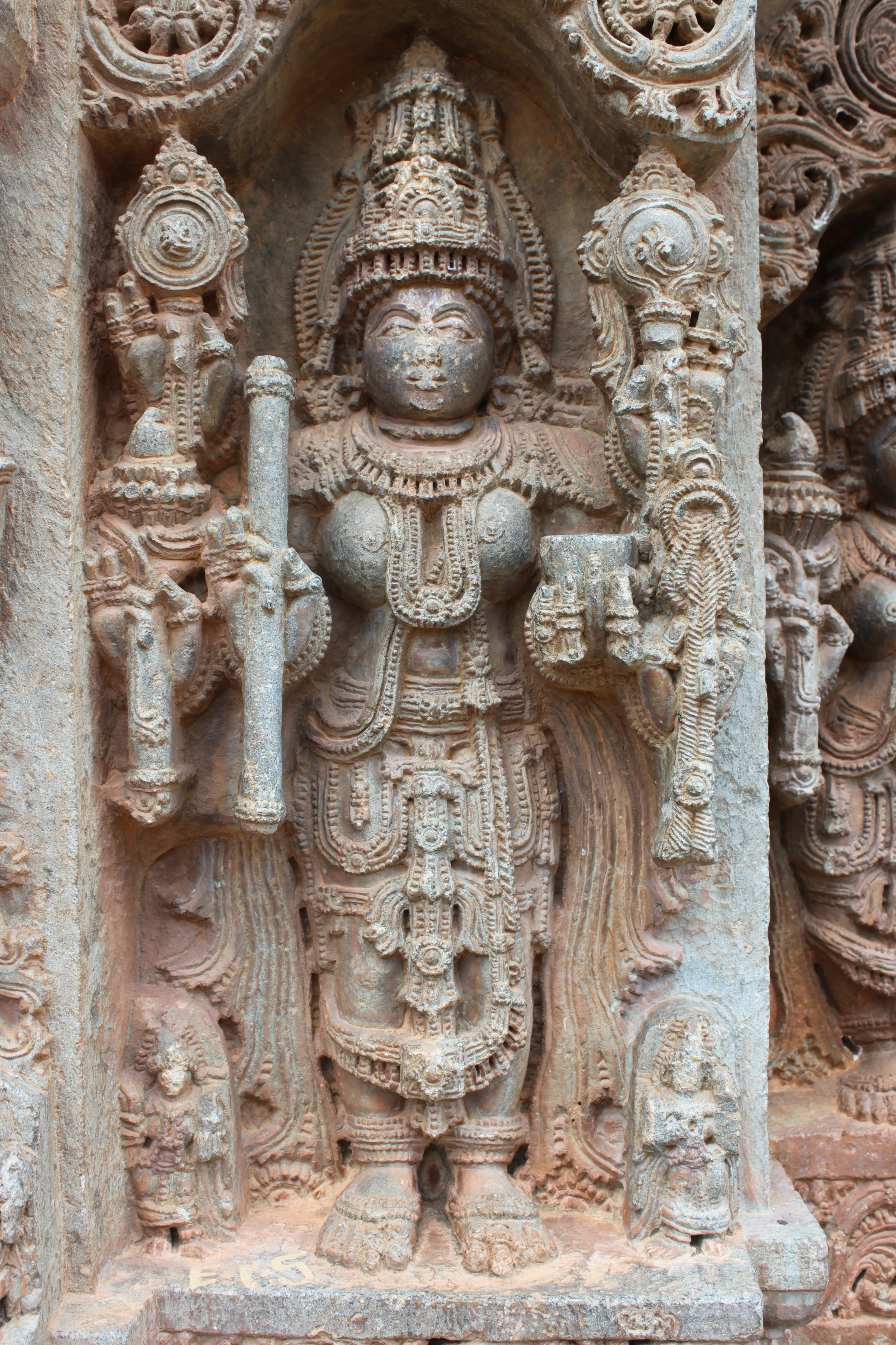 Image courtesy : Saurabh Saxena - https://puratattva.in/ The goddess here is holding Shankha and Chakra in the upper hands. In the lower hands a mortar or a bowl, a club, and what looks like a noose.