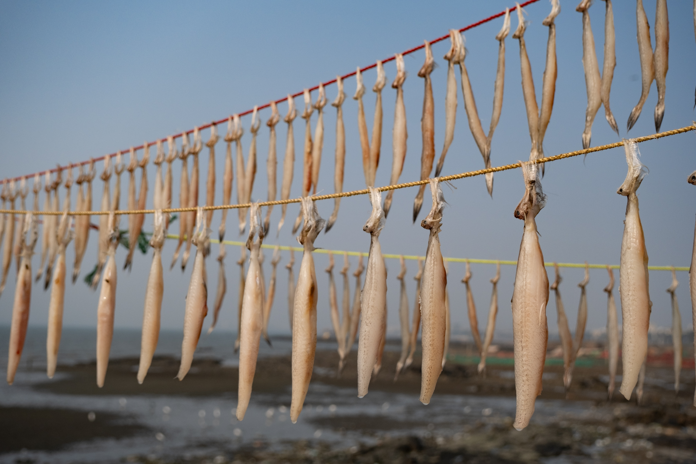 In Khar Danda Koliwada, it is common to see fish drying on lines, swaying gently in the breeze. The fish are strung together with twine and hung from hooks or lines.