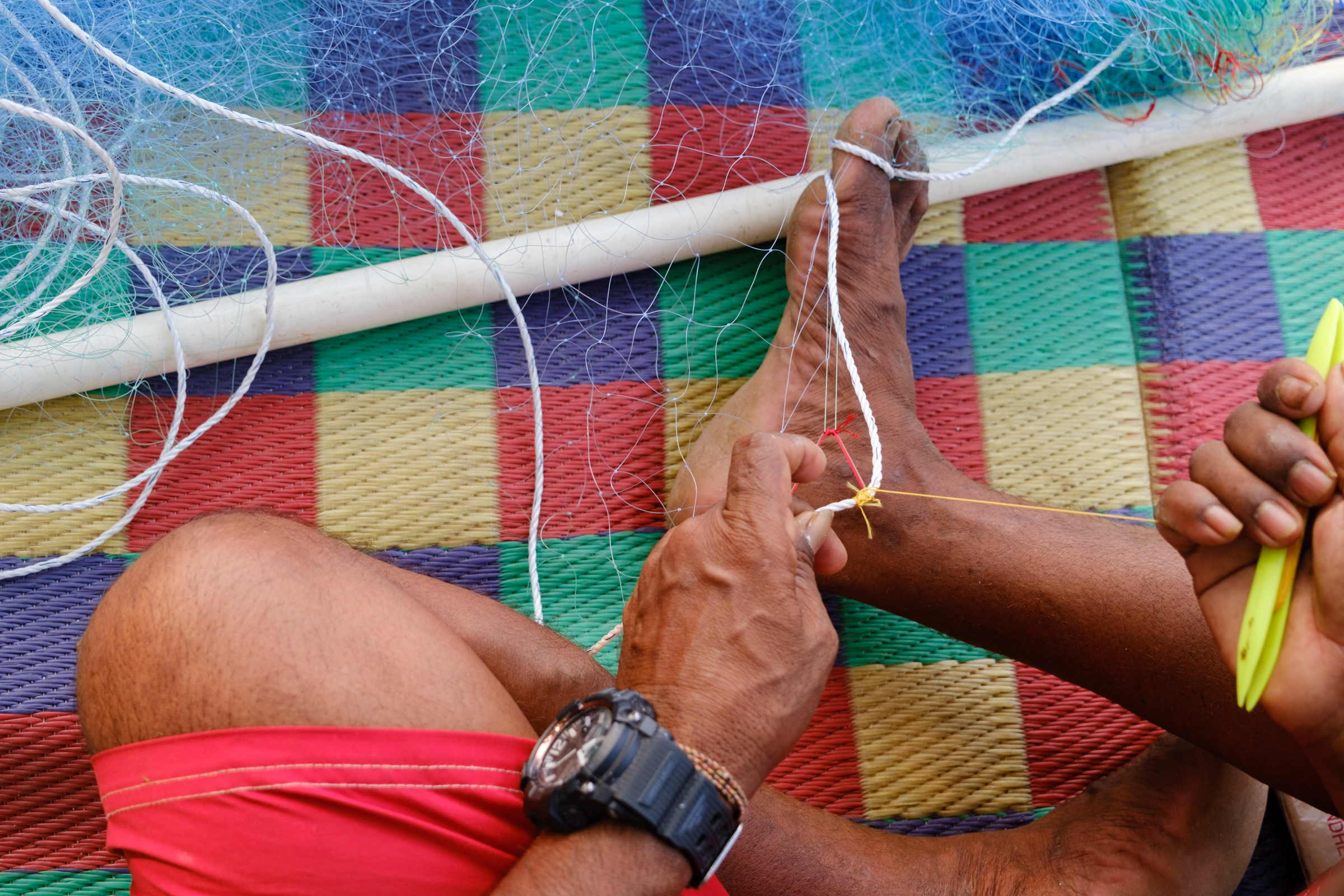 The strength and efficiency of the structure depend on the integrity of the individual meshes. Repairing torn webbing means retying each knot and restoring the original pattern of the mesh. Generally, the repair twine should have the same diameter and be made from the same material as the netting. The key to good repair is to maintain the integrity of meshes.