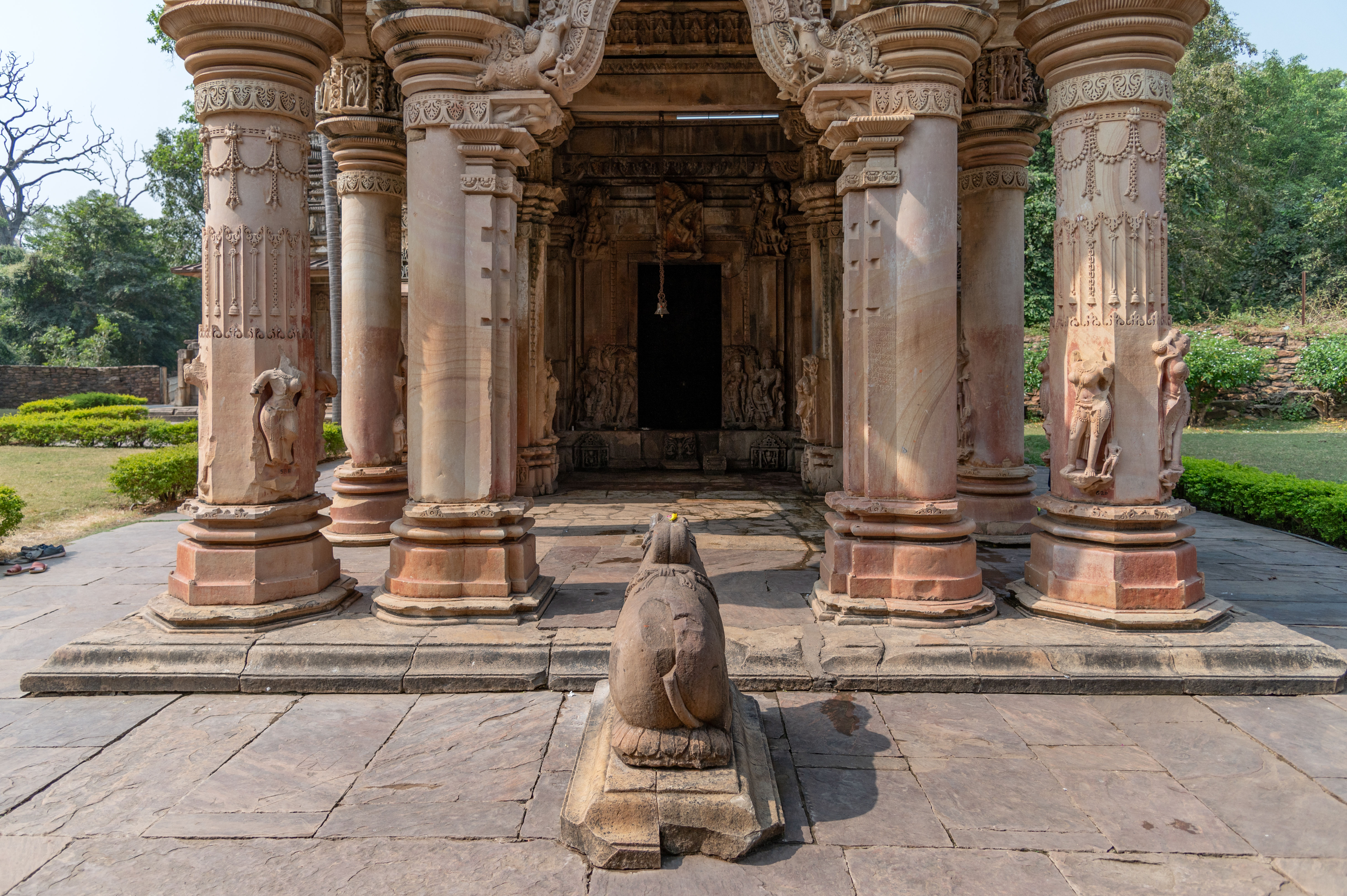 A Nandi is placed just outside the mukhamandapa (front porch), in the space between the separate rangamandapa (open type of pillared hall) and mukhamandapa. The mukhamandapa has pillars and a makara-torana (ornamental arch adorned with intricate carvings of mythical creatures) at the front. The pillars consist of mouldings at the base, shaft, and cushion abacus topped by panels that support the brackets.