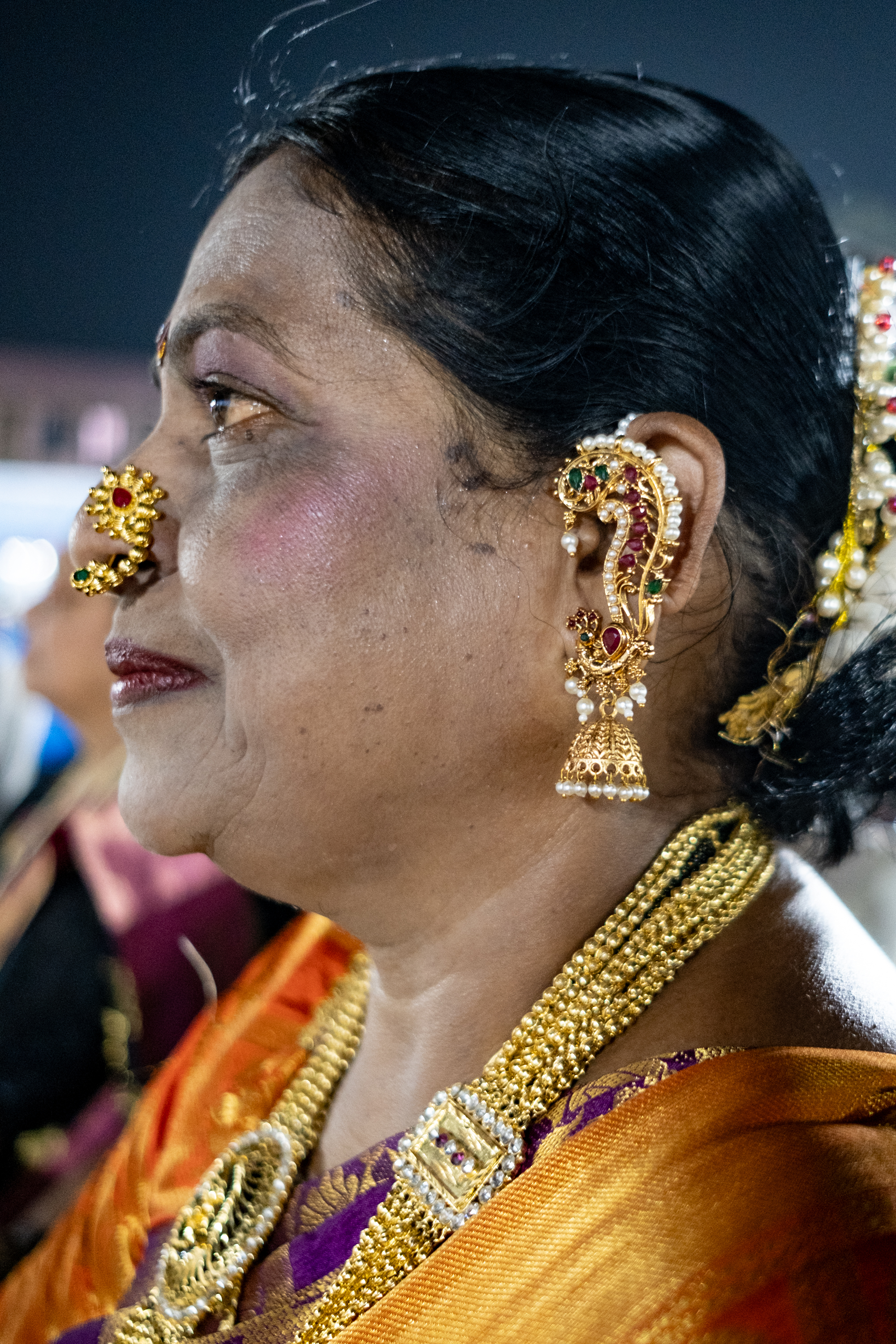 Married Koli women wear nath (nose ring) and bugadi (traditional ear ornaments that hang from the upper part of the ear). These pieces are significant parts of the Koli bridal attire and symbolize the community’s cultural identity.