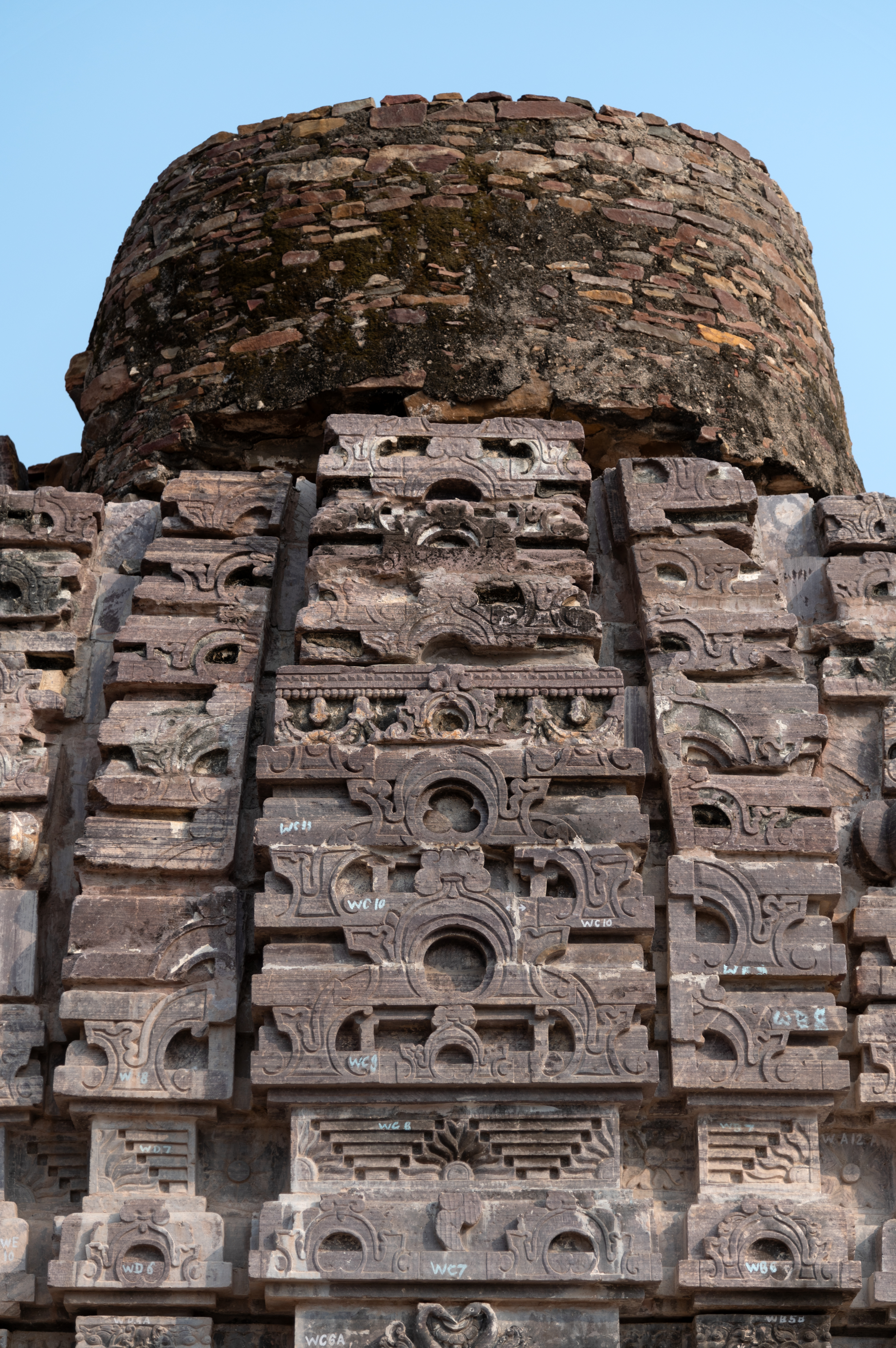 Seen here are the details of the latina shikhara (mono-spire superstructure) of the side shrine from the Triple-shrine Temple. It consists of a broad band as the madhyalata (central band), which is made up of a mesh of gavaksha (chaitya dormer motifs) stacked up in an ascending order. As the shikhara tapers upwards, the chaitya dormer motifs diminish in size. The base of the shikhara is also made up of protruding moulding along with a decorative recess. The bands flanking the madhyalata are thinner and made up of half the designs of the chaitya dormer.