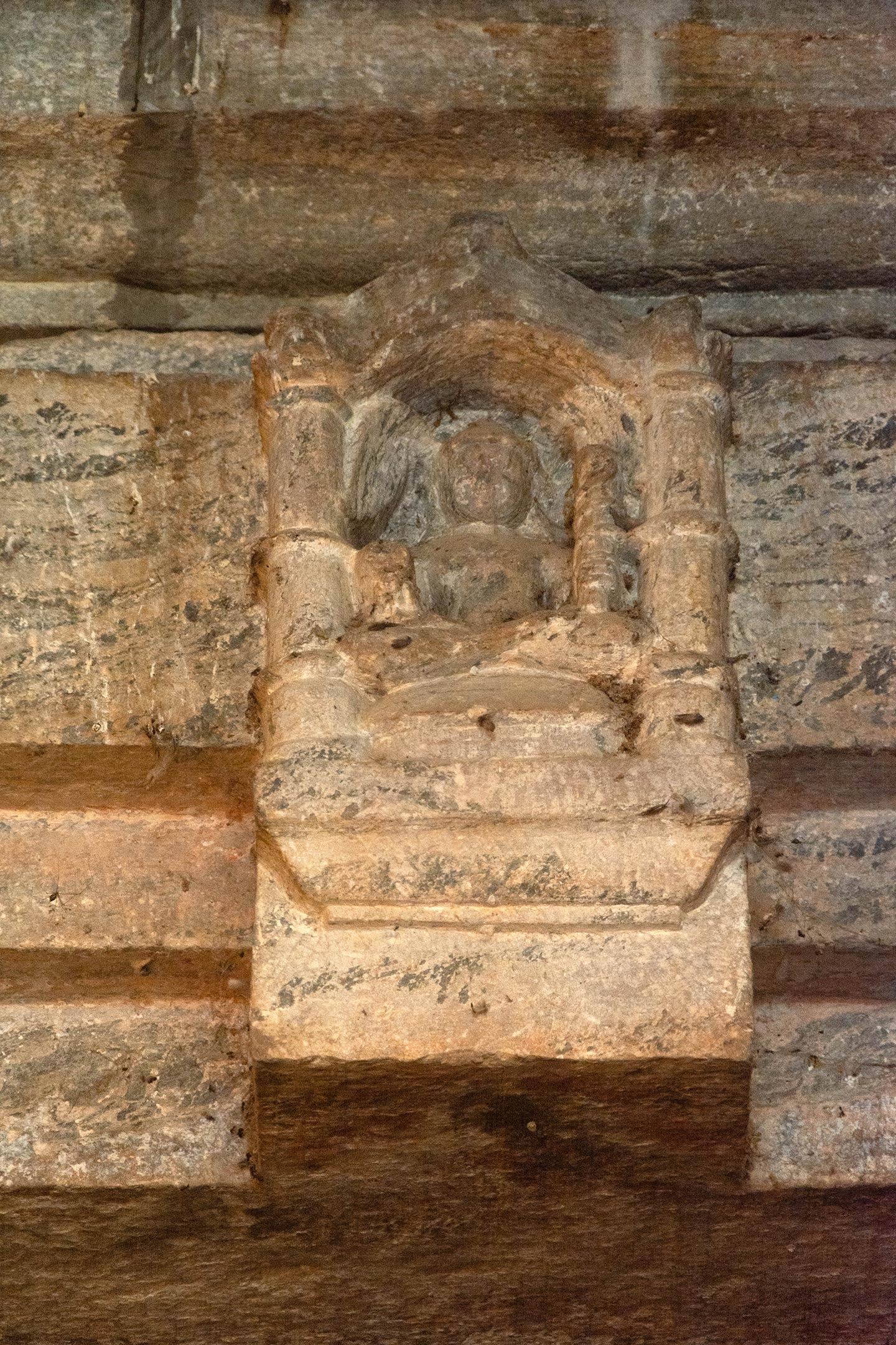 The lintel of the sanctum-doorway shows a two-armed depiction of Lakulisha seated in padmasana in dhyanmudra, carrying a lakuta, or club, in his left hand and a fruit in his right hand—part of his standard iconography—inside a niche on the lalatabimba. On either side of the lintel is a four-armed depiction of Brahma on the left and of Vishnu on the right. Replacement of the image of Shiva with Lakulisha at the lintel niches of the sanctum doorway was once a common feature of the Pashupata tradition.