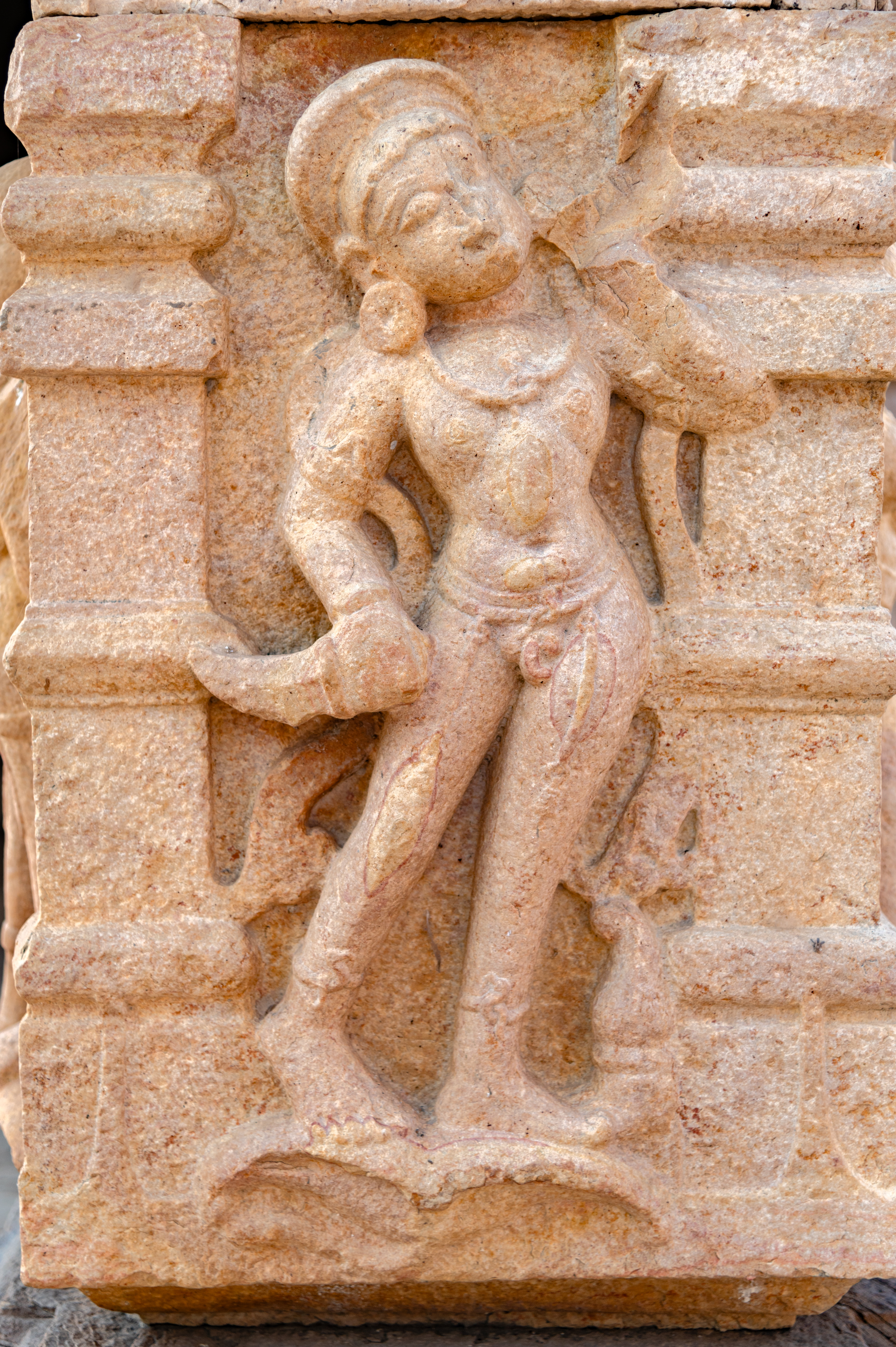A closer examination of the front pillar of the mandapa (pillared hall) reveals a male deity adorning its surface. Poised upon a lotus, he stands with a serene countenance and is depicted with two arms. In his right hand, he holds a dagger, while his left-hand lifts a bowl to his lips. Adorned with serpents as jewellery, these creatures coil around his neck, waist, and ankles, adding a mystical allure to his presence.
